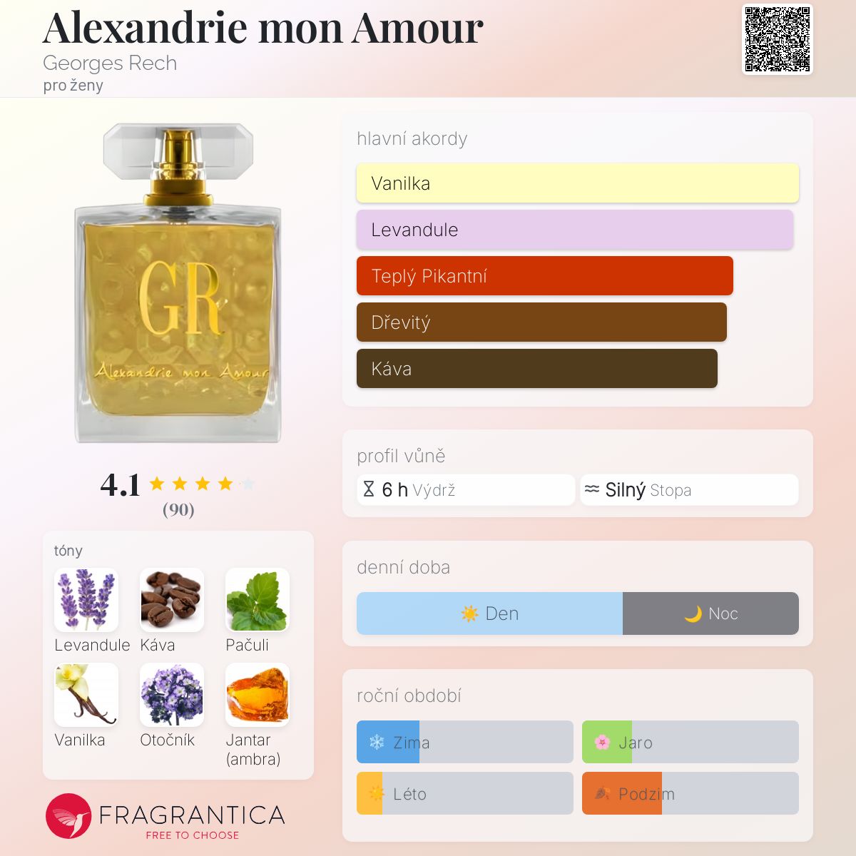 Alexandrie mon Amour podle Georges Rech je vůně pro ženy. Vrchní tóny jsou Levandule, Červené ovoce a Mandarinka; střední tóny jsouKáva a Otočník ; základní tóny jsou Pačuli, Vanilka, Jantar (ambra) a Brazilské červené dřevo.