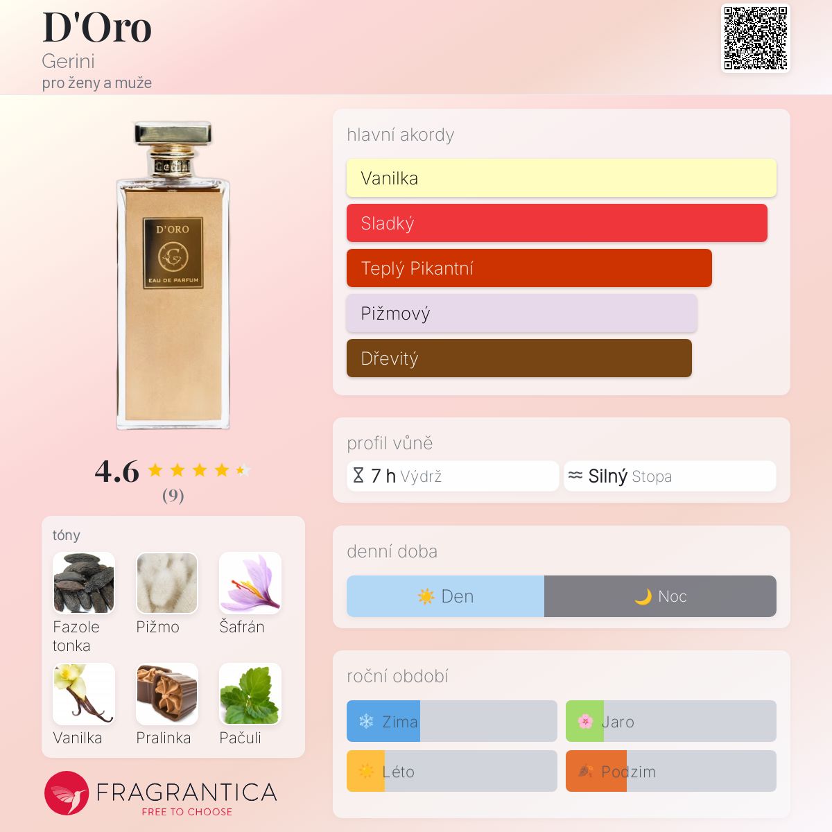 D'Oro podle Gerini je Orientální Floral vůně pro ženy a muže. D'Oro byl/a uveden/a v roce 2017. Vrchní tóny jsou Šafrán, Maliny a Bergamot; střední tóny jsouPralinka, Pomerančový květ a Jasmín ; základní tóny jsou Fazole tonka, Pižmo, Vanilka, Pačuli, Cedr, Dubový mech a Jantar (ambra).