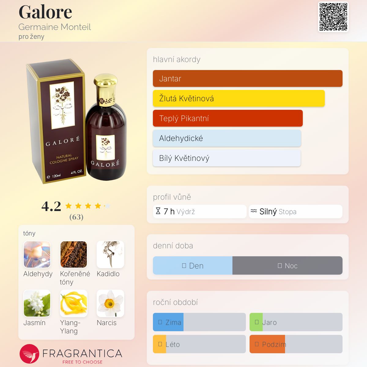 Galore podle Germaine Monteil je Orientální Floral vůně pro ženy. Galore byl/a uveden/a v roce 1964. Vrchní tóny jsou Aldehydy, Koření, Mandarinka a Bergamot; střední tóny jsouJasmín, Ylang-Ylang, Narcis, Růže a Konvalinka ; základní tóny jsou Kadidlo, Jantar (ambra), Vanilka a Vetiver.