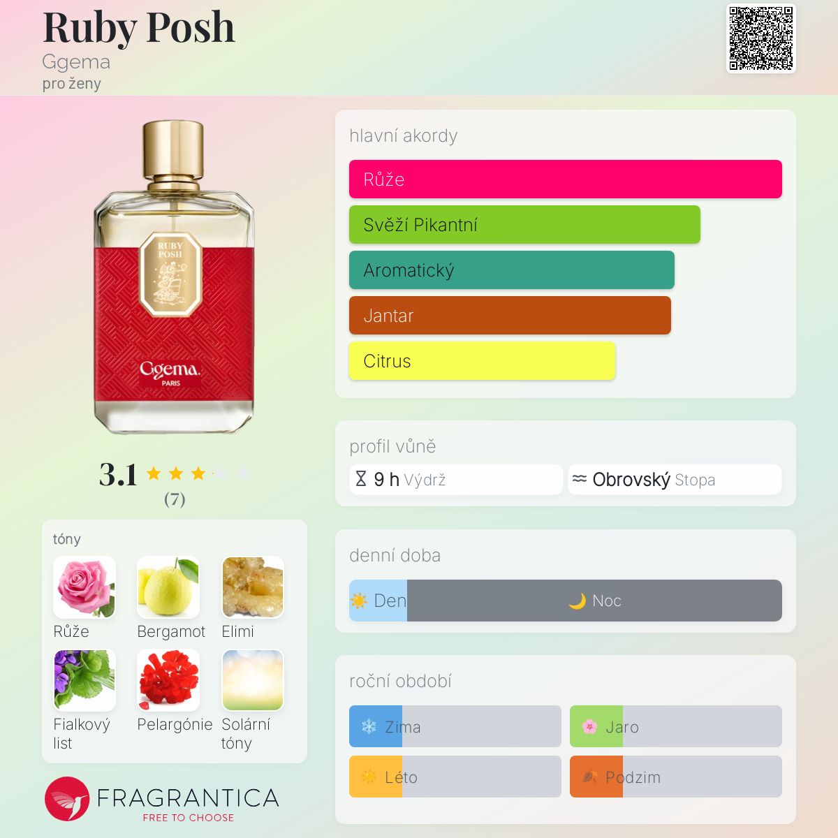 Ruby Posh podle Ggema je Floral vůně pro ženy. Ruby Posh byl/a uveden/a v roce 2023. "Nosem" za touto vůní je Dominique Ropion. Vrchní tóny jsou Bergamot, Elimi a Fialkový list; střední tóny jsouRůžový olej, Pelargónie, Solární tóny a Olibanum ; základní tóny jsou Labdanum, Agarové dřevo (oud) a Pačuli.