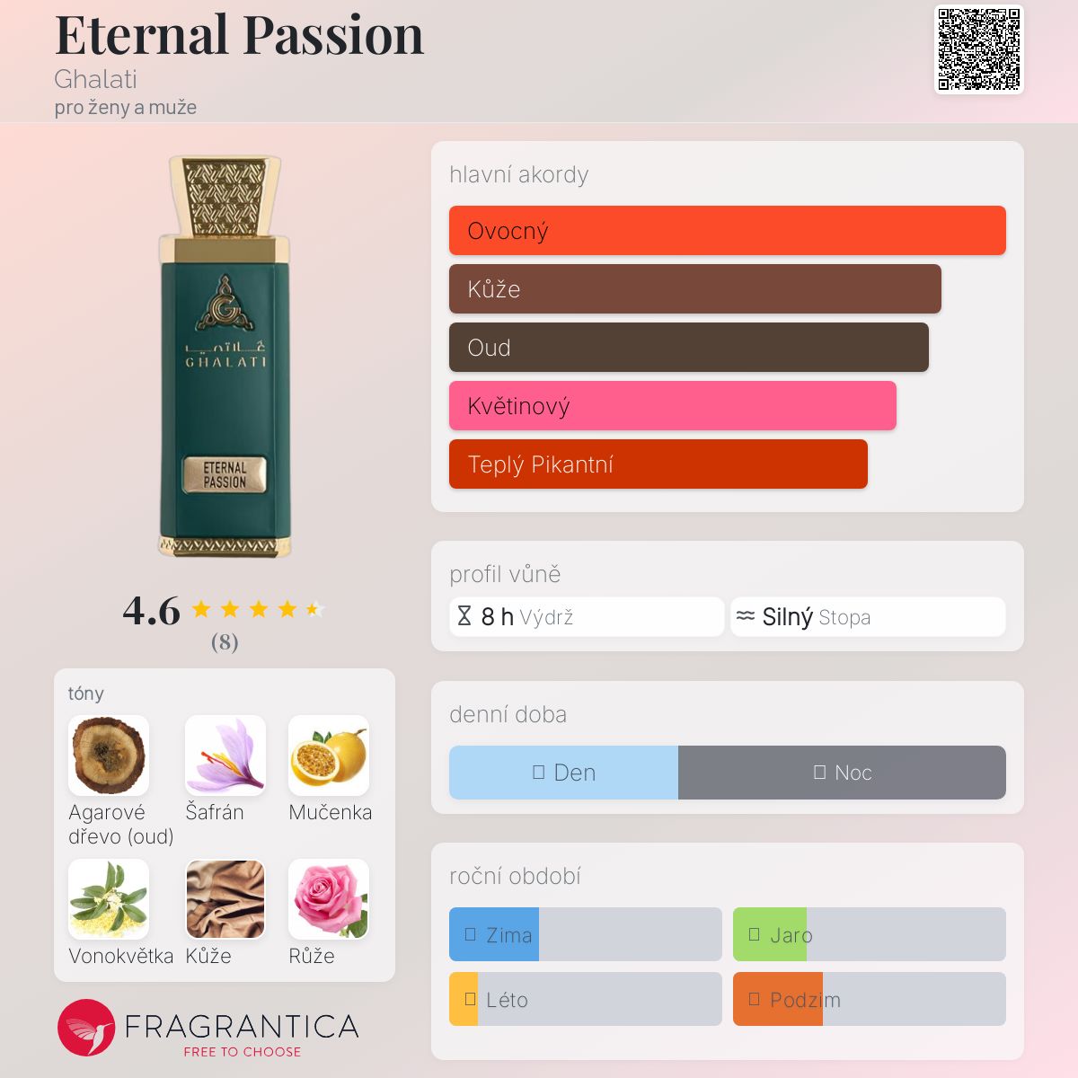 Eternal Passion podle Ghalati je Floral Fruity vůně pro ženy a muže. Toto je nová vůně. Eternal Passion byl/a uveden/a v roce 2025. "Nosem" za touto vůní je Dominique Ropion. Vrchní tóny jsou Šafrán, Mučenka, Grapefruit a Červené bobule; střední tóny jsouAgarové dřevo (oud), Vonokvětka, Růže a Kosatec ; základní tóny jsou Kůže, Pačuli a Pižmo.
