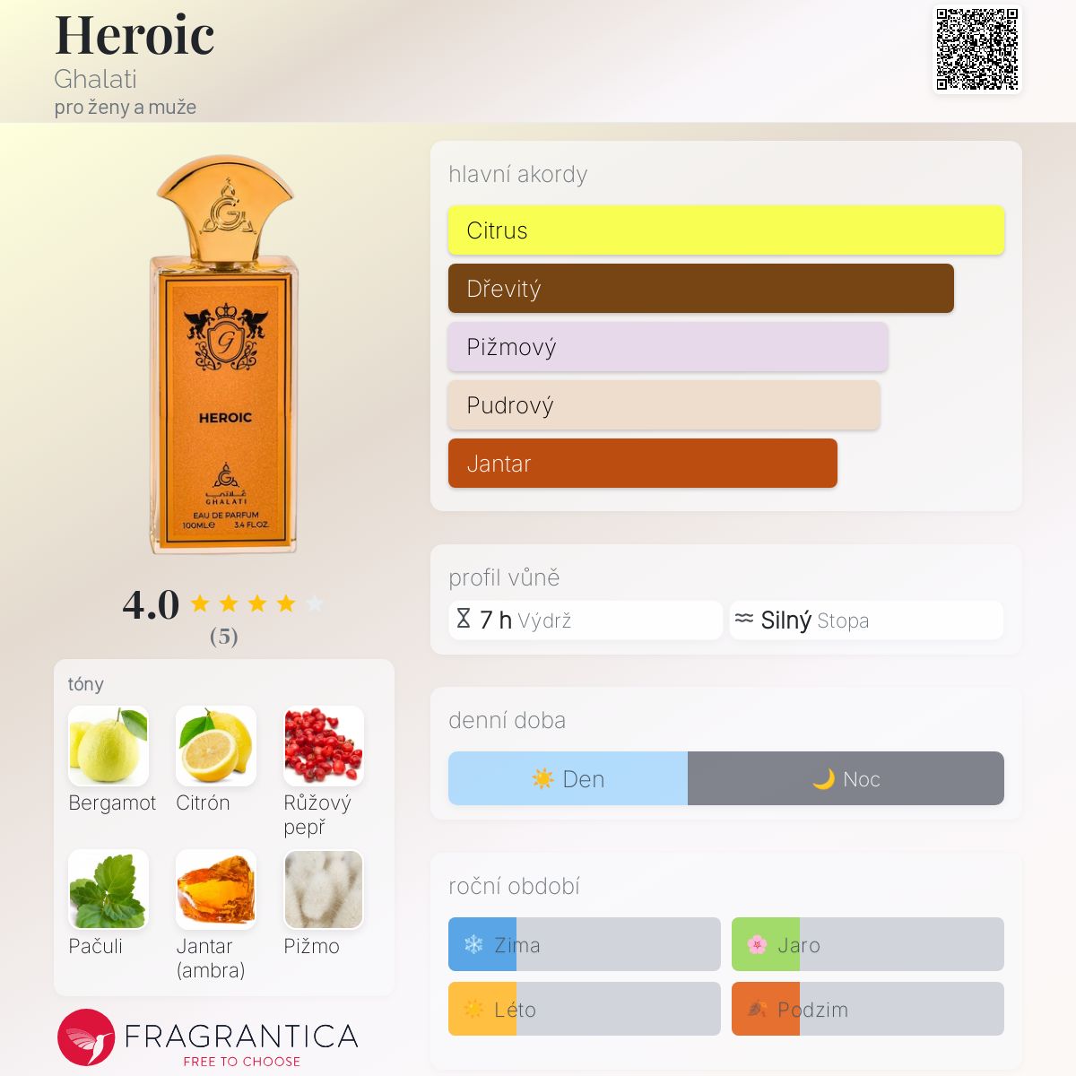 Heroic podle Ghalati je Orientální Woody vůně pro ženy a muže. Heroic byl/a uveden/a v roce 2023. "Nosem" za touto vůní je Shadi Samra. Vrchní tóny jsou Bergamot, Citrón a Růžový pepř; střední tón jeList indonéského pačuli ; základní tóny jsou Jantar (ambra), Pižmo a Santalové dřevo.