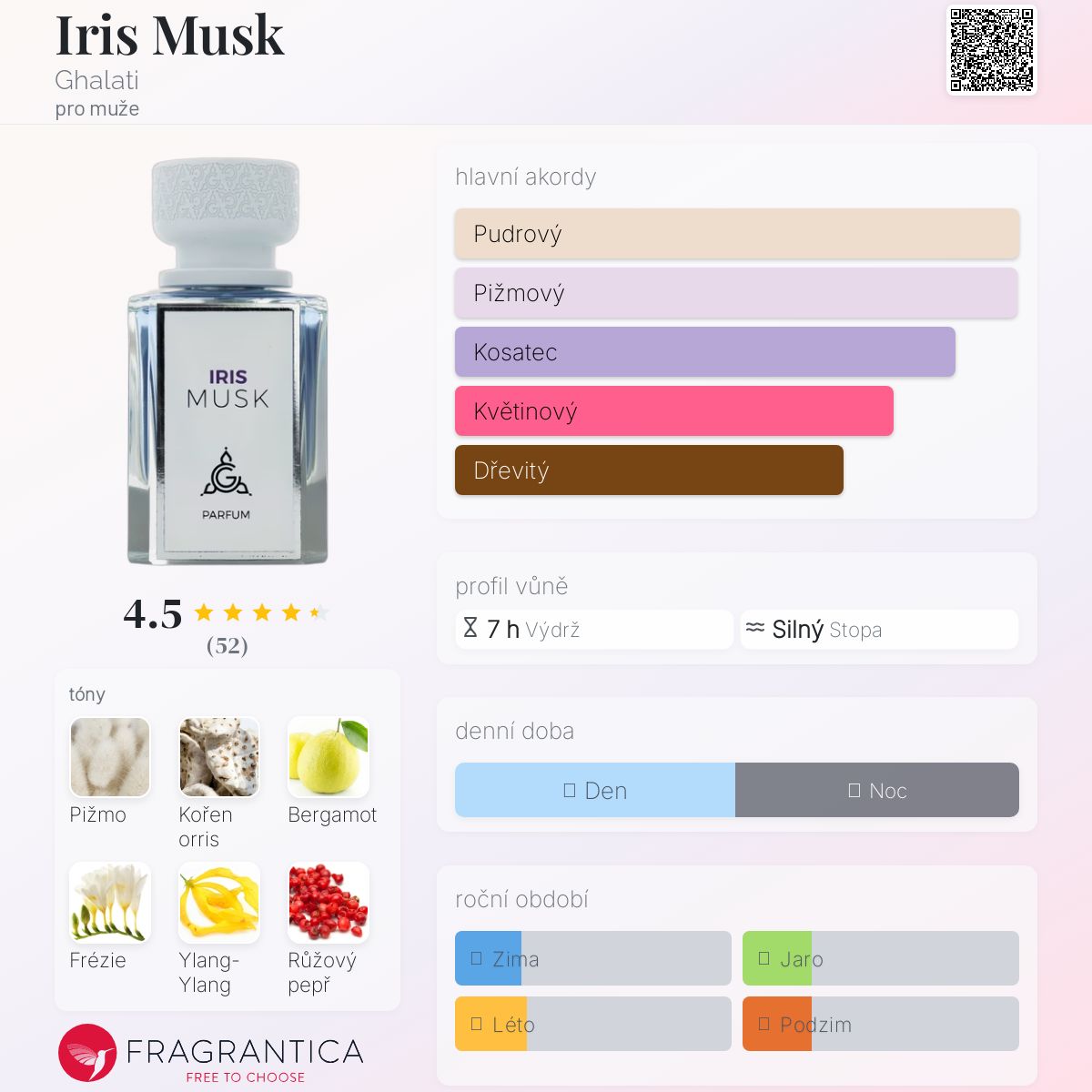 Iris Musk podle Ghalati je Woody Floral Musk vůně pro muže. Iris Musk byl/a uveden/a v roce 2022. "Nosem" za touto vůní je Jean-Louis Sieuzac. Vrchní tóny jsou Bergamot a Růžový pepř; střední tóny jsouOrris, Frézie a Madagarská kananga ; základní tóny jsou Pižmo, Fazole tonka a Jantarové dřevo.