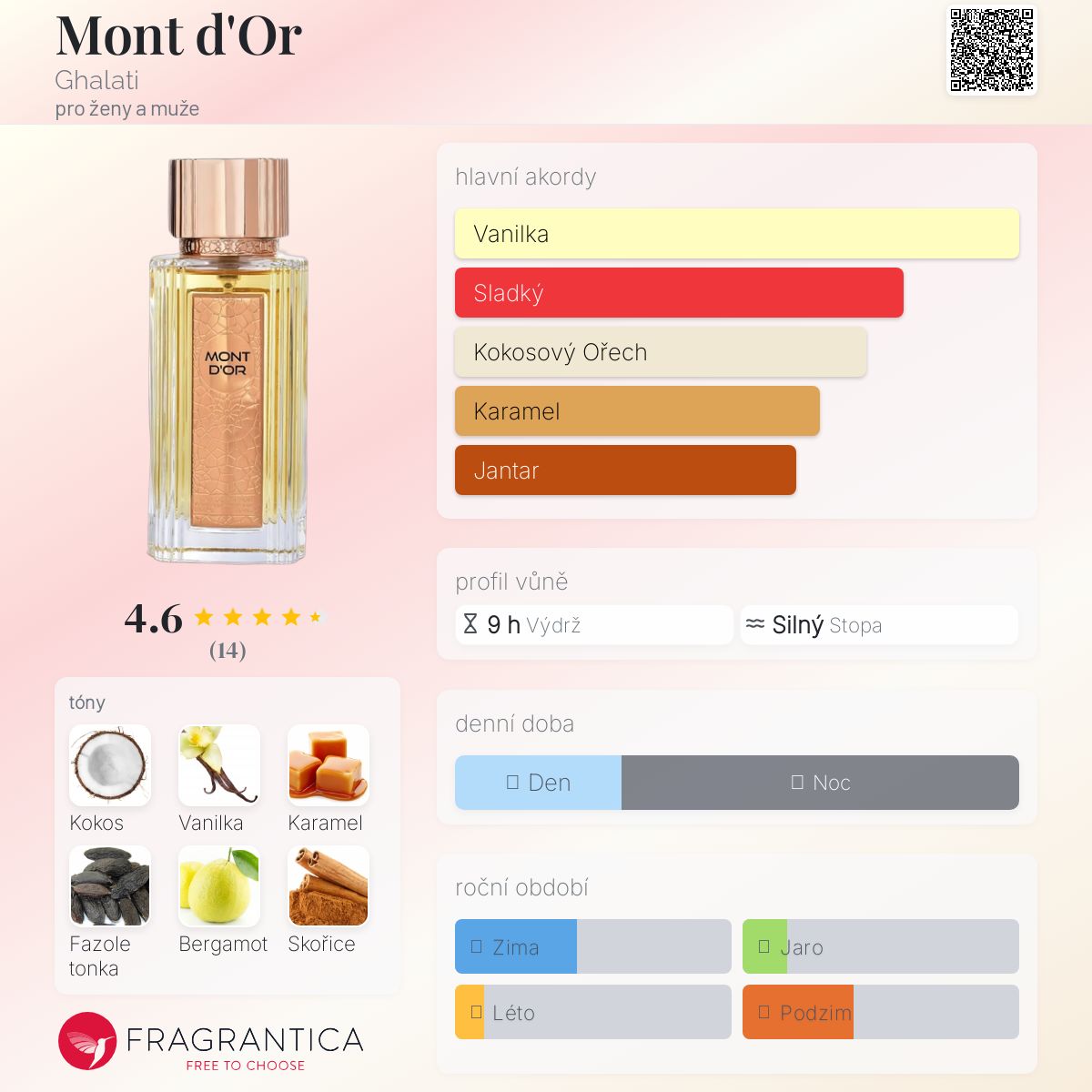 Mont d'Or podle Ghalati je Orientální Vanilla vůně pro ženy a muže. Toto je nová vůně. Mont d'Or byl/a uveden/a v roce 2024. "Nosem" za touto vůní je Jordi Fernández. Vrchní tóny jsou Skořice a Bergamot; střední tóny jsouKokos a Karamel ; základní tóny jsou Vanilka, Fazole tonka a Jantar (ambra).