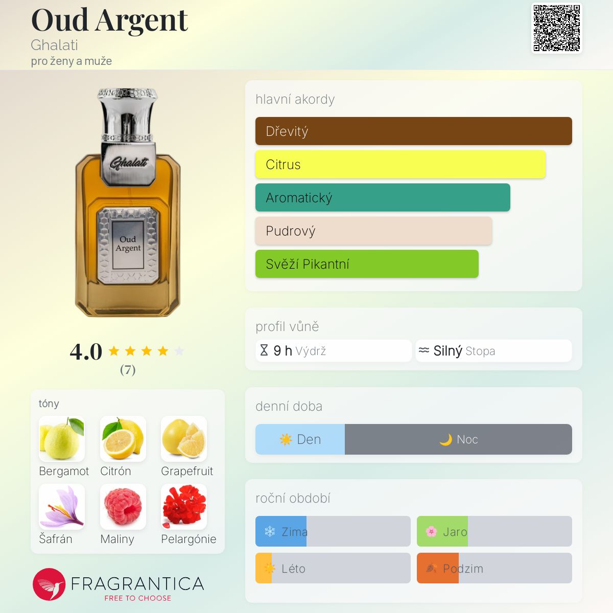 Oud Argent podle Ghalati je Orientální Floral vůně pro ženy a muže. Oud Argent byl/a uveden/a v roce 2022. "Nosem" za touto vůní je Chris Maurice. Vrchní tóny jsou Bergamot, Citrón, Grapefruit, Šafrán a Maliny; střední tóny jsouPelargónie, Růže, Jasmín, Guajakové dřevo, Fialka, Cedr a Kůže ; základní tóny jsou Pižmo, Jantar (ambra), Vetiver, Pačuli a Vanilka.