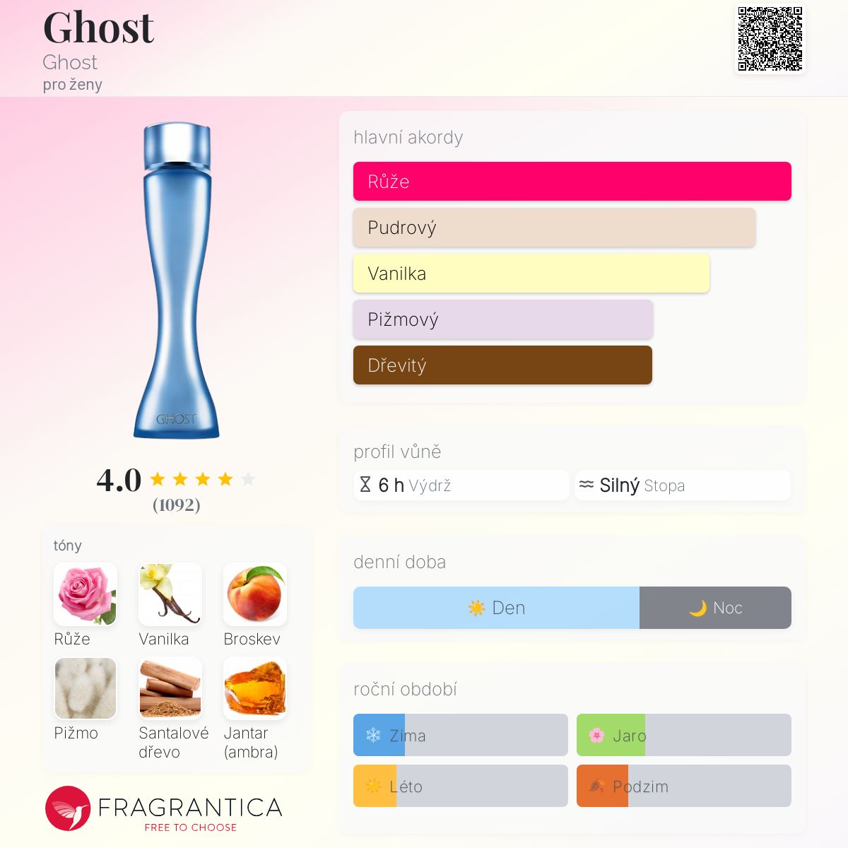 Ghost podle Ghost je Floral Fruity vůně pro ženy. Ghost byl/a uveden/a v roce 2000. "Nosem" za touto vůní je Michel Almairac. Vrchní tóny jsou Růže a Jasmín; střední tóny jsouVanilka, Broskev a Jantar (ambra) ; základní tóny jsou Pižmo a Santalové dřevo.
