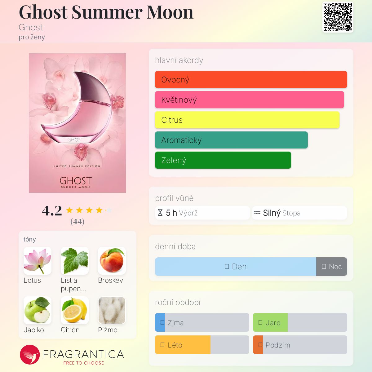 Ghost Summer Moon podle Ghost je Floral Fruity vůně pro ženy. Ghost Summer Moon byl/a uveden/a v roce 2003. "Nosem" za touto vůní je Jean-Louis Grauby. Vrchní tóny jsou Kasie, Broskev, Jablko, Citrón, Mandarinka a Bergamot; střední tóny jsouLotus, Frézie, Růže a Měsíček ; základní tóny jsou Pižmo a Santalové dřevo.