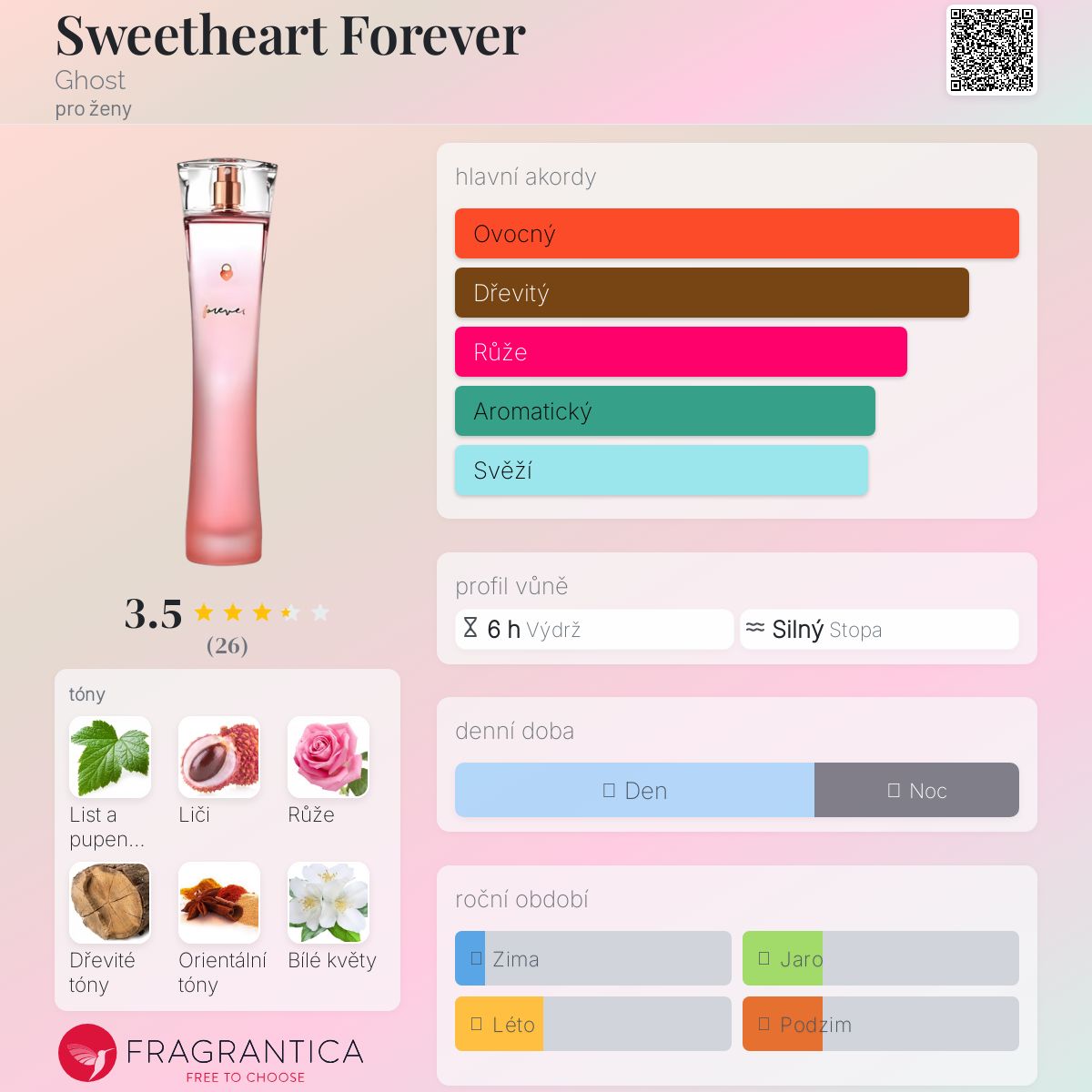 Sweetheart Forever podle Ghost je Orientální Floral vůně pro ženy. Sweetheart Forever byl/a uveden/a v roce 2017. Vrchní tóny jsou Černý rybíz, Liči a Pomeranč; střední tóny jsouRůže a Bílé květy ; základní tóny jsou Dřevité tóny a Orientální tóny.