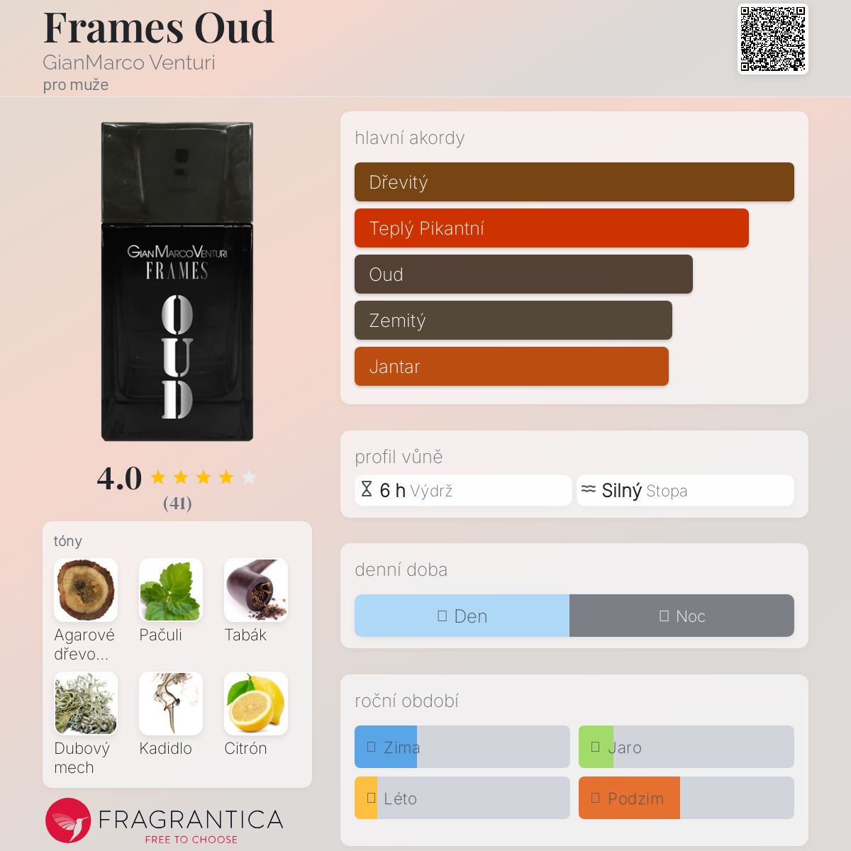 Frames Oud podle GianMarco Venturi je Woody vůně pro muže. Frames Oud byl/a uveden/a v roce 2017. Vrchní tóny jsou Kadidlo, Citrón a Kardamom; střední tóny jsouAgarové dřevo (oud), Pačuli, Palisandr a Papyrus ; základní tóny jsou Tabák a Dubový mech.