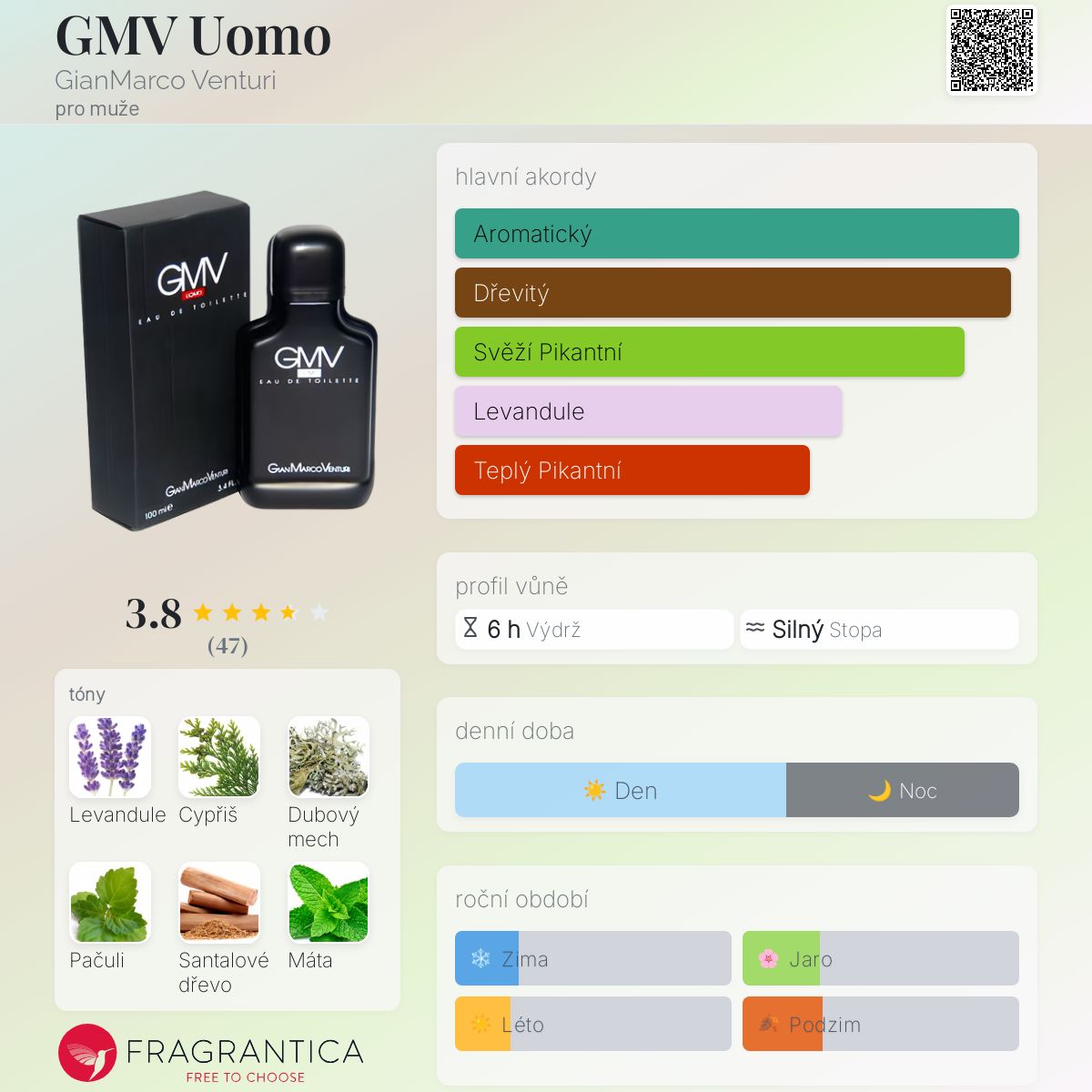 GMV Uomo podle GianMarco Venturi je Chypre vůně pro muže. GMV Uomo byl/a uveden/a v roce 1997. Vrchní tóny jsou Cypřiš, Máta a Bergamot; střední tóny jsouLevandule, Pačuli a Pelargónie ; základní tóny jsou Dubový mech a Santalové dřevo.