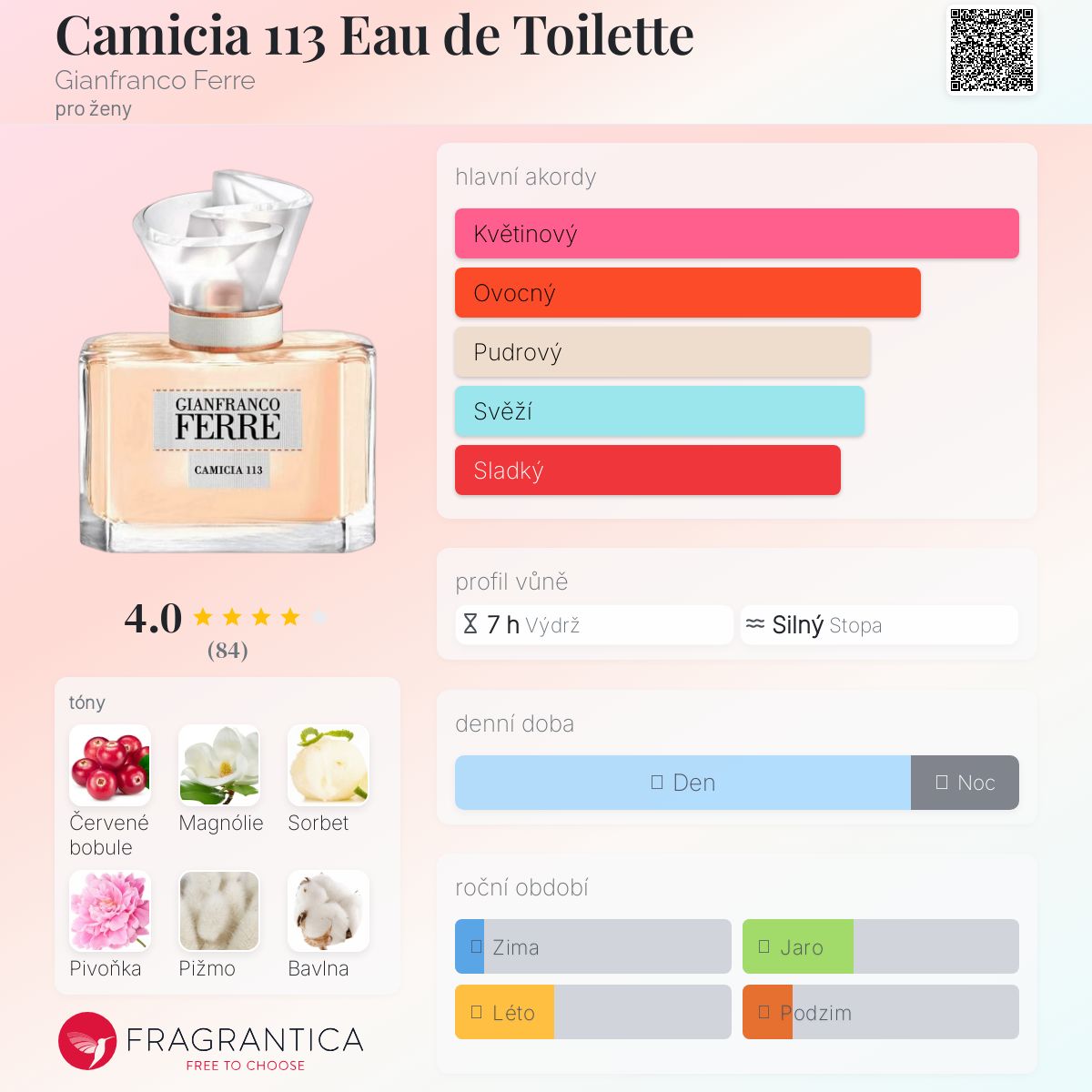 Camicia 113 Eau de Toilette podle Gianfranco Ferre je Chypre Floral vůně pro ženy. Camicia 113 Eau de Toilette byl/a uveden/a v roce 2016. "Nosem" za touto vůní je Nathalie Lorson. Vrchní tóny jsou Červené bobule, Magnólie, Sorbet a Sicilský bergamot; střední tóny jsouPivoňka, Bavlna a Jasmín ; základní tóny jsou Pižmo, Kosatec a Pačuli.