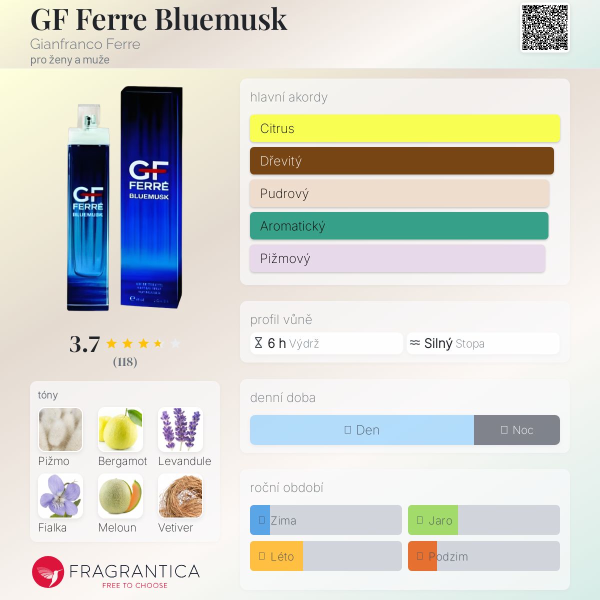 GF Ferre Bluemusk podle Gianfranco Ferre je Woody Aromatic vůně pro ženy a muže. GF Ferre Bluemusk byl/a uveden/a v roce 2007. "Nosem" za touto vůní je Pierre Bourdon. Vrchní tóny jsou Pižmo, Bergamot, Meloun, Černý rybíz, Ananas a Mandarinka; střední tóny jsouPižmo, Levandule, Fialka a Jasmín ; základní tóny jsou Vetiver, Ambra, Pačuli a Mahagon.