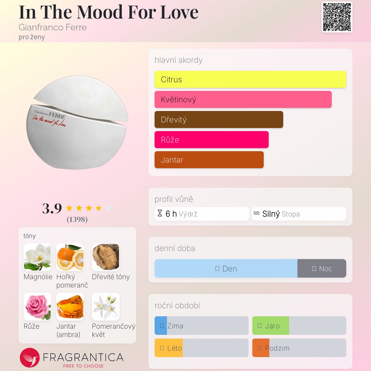 In The Mood For Love podle Gianfranco Ferre je Floral Fruity vůně pro ženy. In The Mood For Love byl/a uveden/a v roce 2009. "Nosem" za touto vůní je Maurice Roucel. Vrchní tóny jsou Magnólie, Hořký pomeranč, Bílá růže, Bergamot a Tamarind; střední tóny jsouČervená růže, Pomerančový květ, Jasmín, Konvalinka a Cedr ; základní tóny jsou Dřevité tóny, Jantar (ambra), Bílé pižmo a Santalové dřevo.