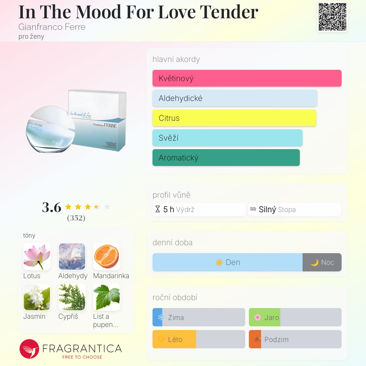 In The Mood For Love Tender podle Gianfranco Ferre je Floral Fruity vůně pro ženy. In The Mood For Love Tender byl/a uveden/a v roce 2011. "Nosem" za touto vůní je Alienor Massenet. Vrchní tóny jsou Aldehydy, Mandarinka a Černý rybíz; střední tóny jsouLotus, Jasmín a Růže ; základní tóny jsou Cypřiš, Pižmo a Benzoin.