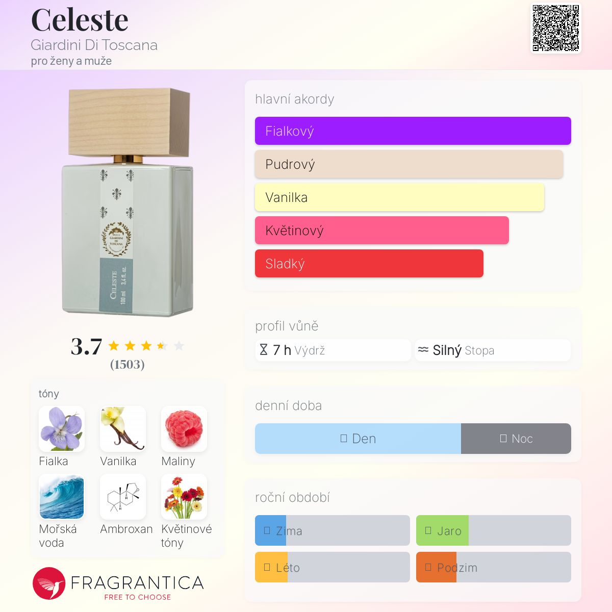 Celeste podle Giardini Di Toscana je Aromatic vůně pro ženy a muže. "Nosem" za touto vůní je Silvia Martinelli. Vrchní tóny jsou Mořská voda a Limetka; střední tóny jsouFialka, Maliny a Exotické květinové tóny ; základní tóny jsou Vanilkový cukr a Ambroxan.