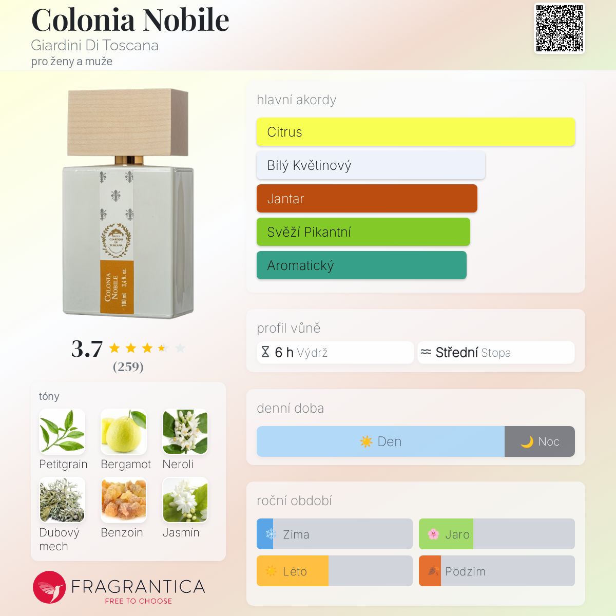 Colonia Nobile podle Giardini Di Toscana je vůně pro ženy a muže. Vrchní tóny jsou Petitgrain, Bergamot a Neroli; střední tóny jsouBenzoin a Jasmín ; základní tóny jsou Dubový mech, Ambroxan a Ambrettolide.