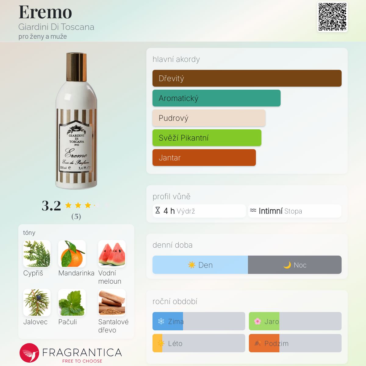 Eremo podle Giardini Di Toscana je vůně pro ženy a muže. "Nosem" za touto vůní je Silvia Martinelli. Vrchní tóny jsou Cypřiš, Mandarinka a Vodní meloun; střední tóny jsouJalovec, Pačuli, Santalové dřevo a Cedr ; základní tóny jsou Jantar (ambra) a Bílé pižmo.