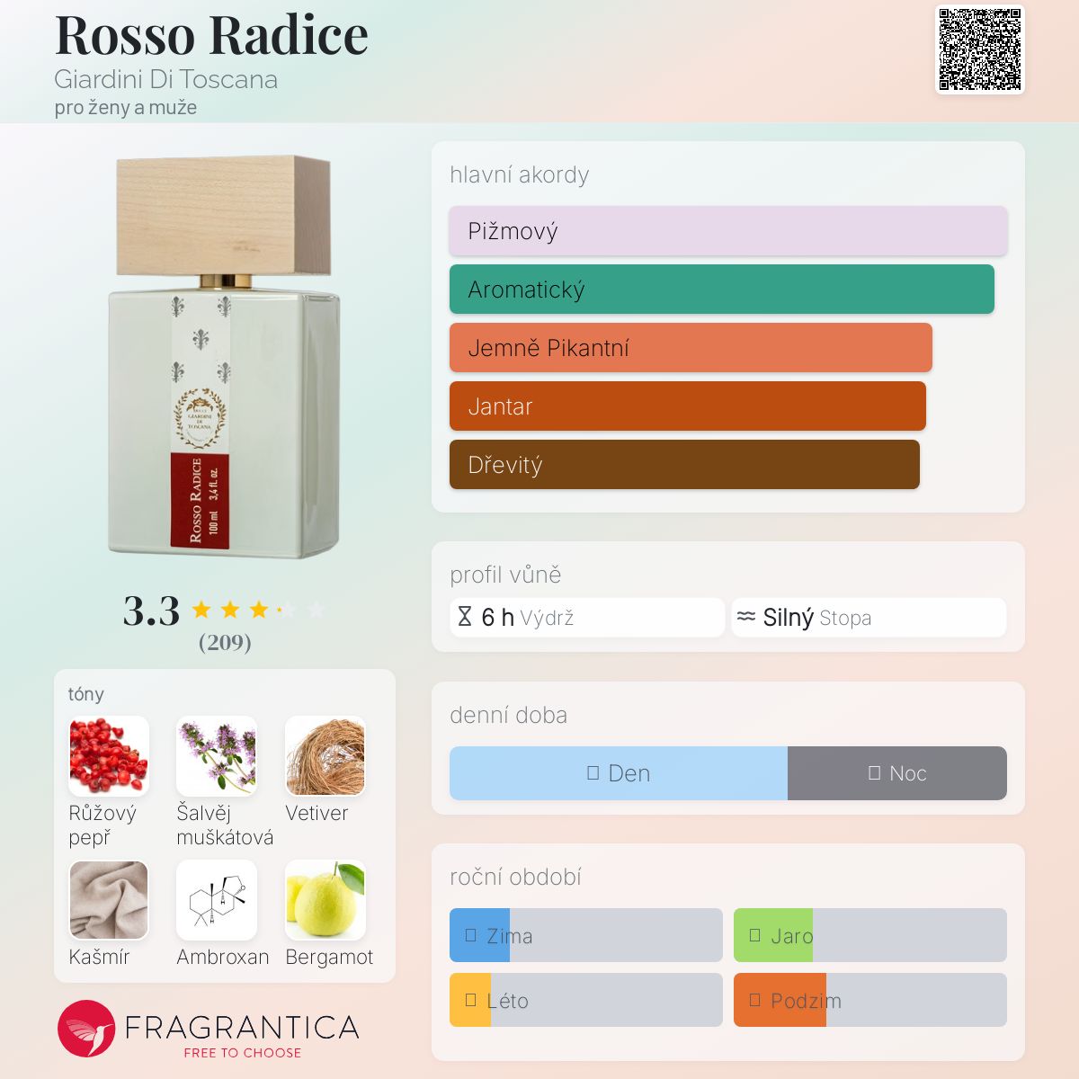 Rosso Radice podle Giardini Di Toscana je Orientální Fougere vůně pro ženy a muže. "Nosem" za touto vůní je Silvia Martinelli. Vrchní tóny jsou Růžový pepř, Šalvěj muškátová a Bergamot; střední tón jeKašmír ; základní tóny jsou Vetiver, Ambroxan a Ambrettolide.