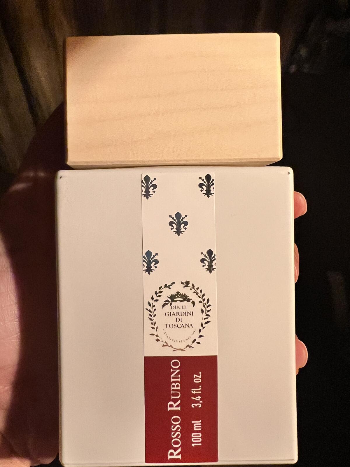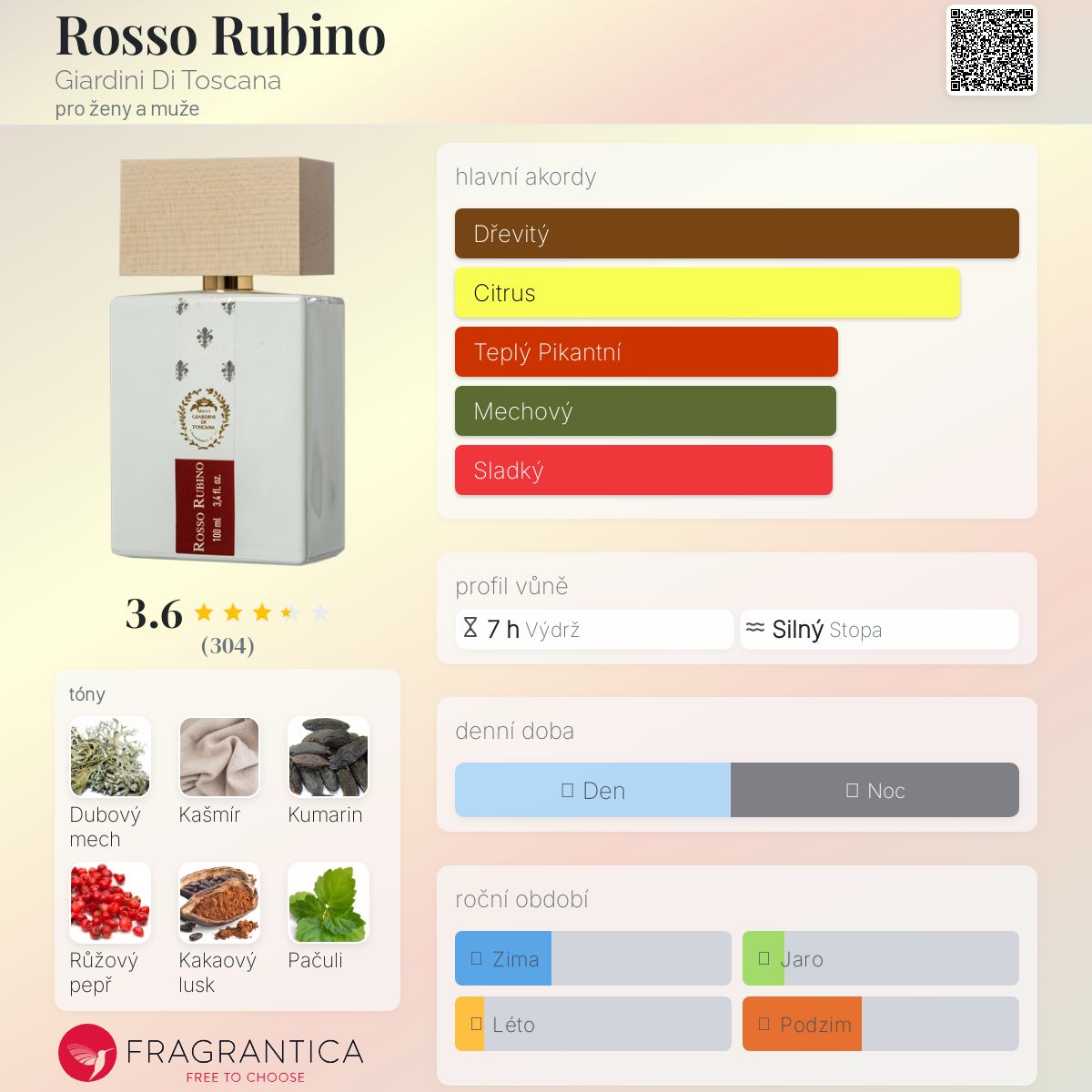 Rosso Rubino podle Giardini Di Toscana je Woody vůně pro ženy a muže. "Nosem" za touto vůní je Silvia Martinelli. Vrchní tóny jsou Bergamot, Citrón a Pomeranč; střední tóny jsouKakaový lusk, Růže a Lesní plody ; základní tóny jsou Dubový mech, Kašmír, Kumarin, Růžový pepř a Pačuli.