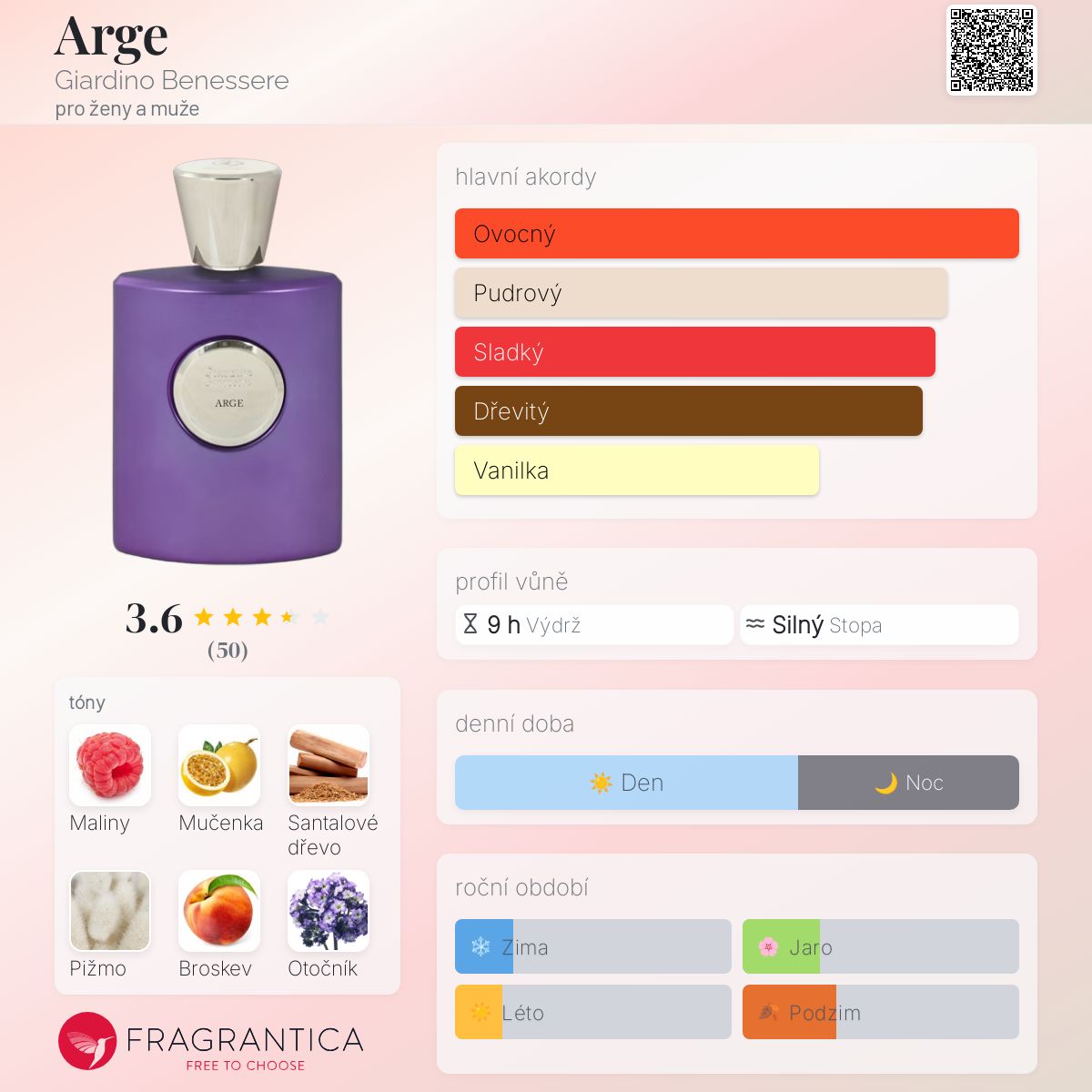 Arge podle Giardino Benessere je vůně pro ženy a muže. Arge byl/a uveden/a v roce 2022. "Nosem" za touto vůní je Paolo Terenzi. Vrchní tóny jsou Maliny, Mučenka a Broskev; střední tóny jsouOtočník, Magnólie, Tuberóza, Konvalinka a Bulharská růže ; základní tóny jsou Australské santalové dřevo, Pižmo, Vanilkový květ, Atlasový cedr, Kůže, Ambra a Singapurské pačuli.