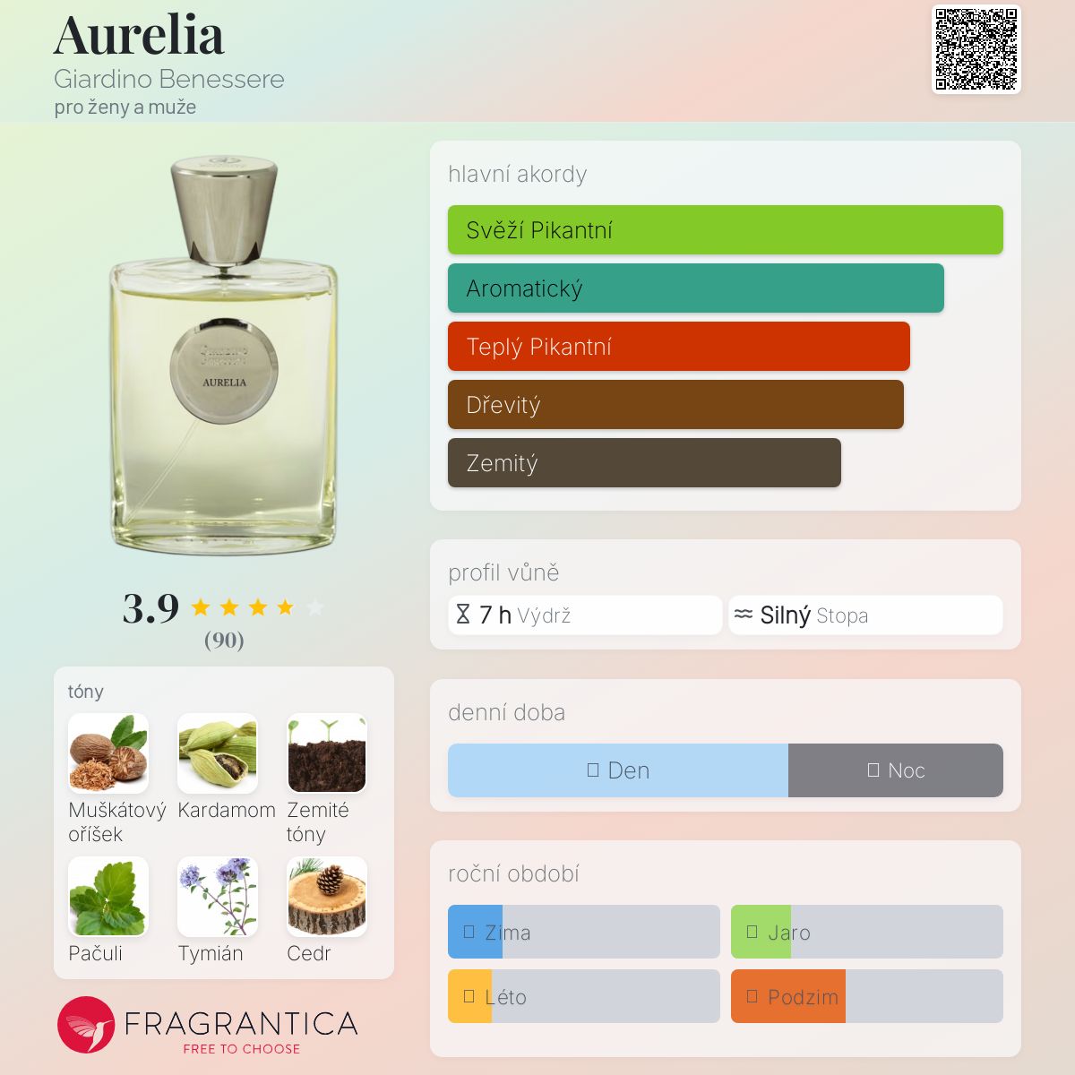 Aurelia podle Giardino Benessere je vůně pro ženy a muže. Aurelia byl/a uveden/a v roce 2017. "Nosem" za touto vůní je Paolo Terenzi. Vrchní tóny jsou Muškátový oříšek, Kardamom, Tymián a Bergamot; střední tóny jsouZemité tóny, Cedr, Pelyněk a Guajakové dřevo ; základní tóny jsou Pačuli a Asfalt.