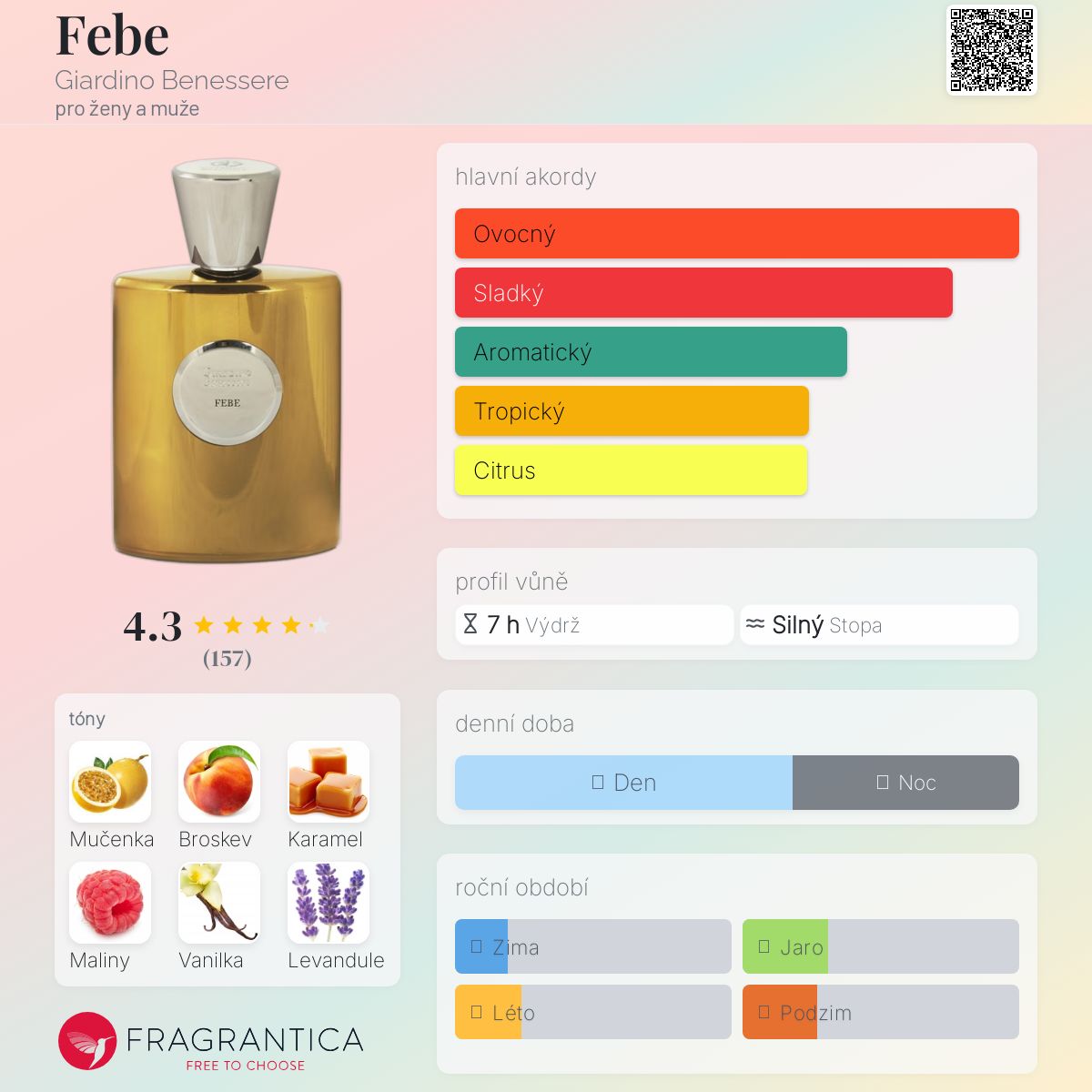 Febe podle Giardino Benessere je vůně pro ženy a muže. Febe byl/a uveden/a v roce 2018. "Nosem" za touto vůní je Paolo Terenzi. Vrchní tóny jsou Mučenka, Černý rybíz, Bergamot a Citrón; střední tóny jsouBroskev, Maliny, Levandule, Absint, Ylang-Ylang, Skořice a Magnólie ; základní tóny jsou Karamel, Vanilka, Pižmo, Pačuli a Jantar (ambra).