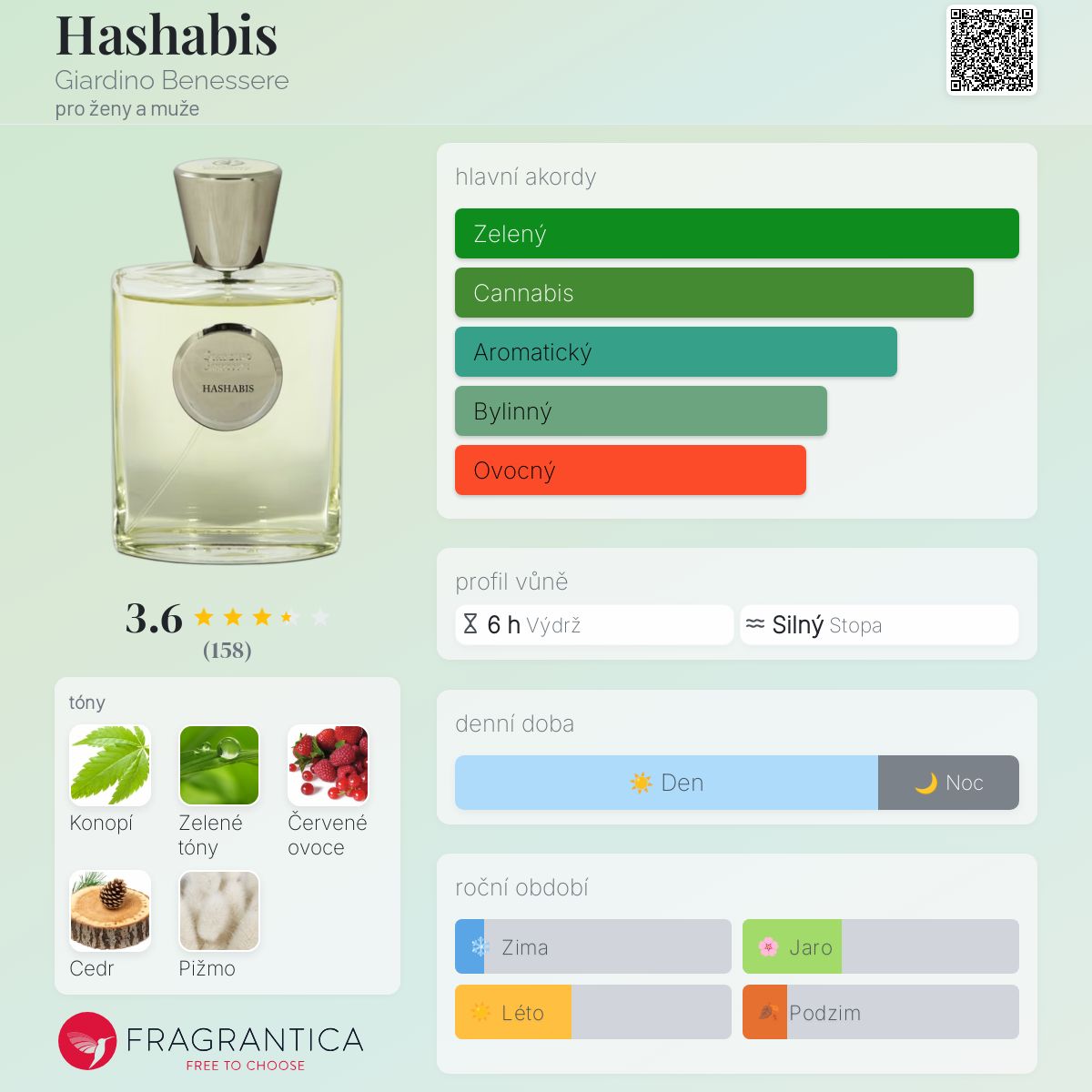 Hashabis podle Giardino Benessere je Aromatic vůně pro ženy a muže. Hashabis byl/a uveden/a v roce 2019. "Nosem" za touto vůní je Paolo Terenzi. Vrchní tóny jsou Zelené tóny a Červené ovoce; střední tóny jsouKonopí a Červené ovoce ; základní tóny jsou Cedr a Pižmo.