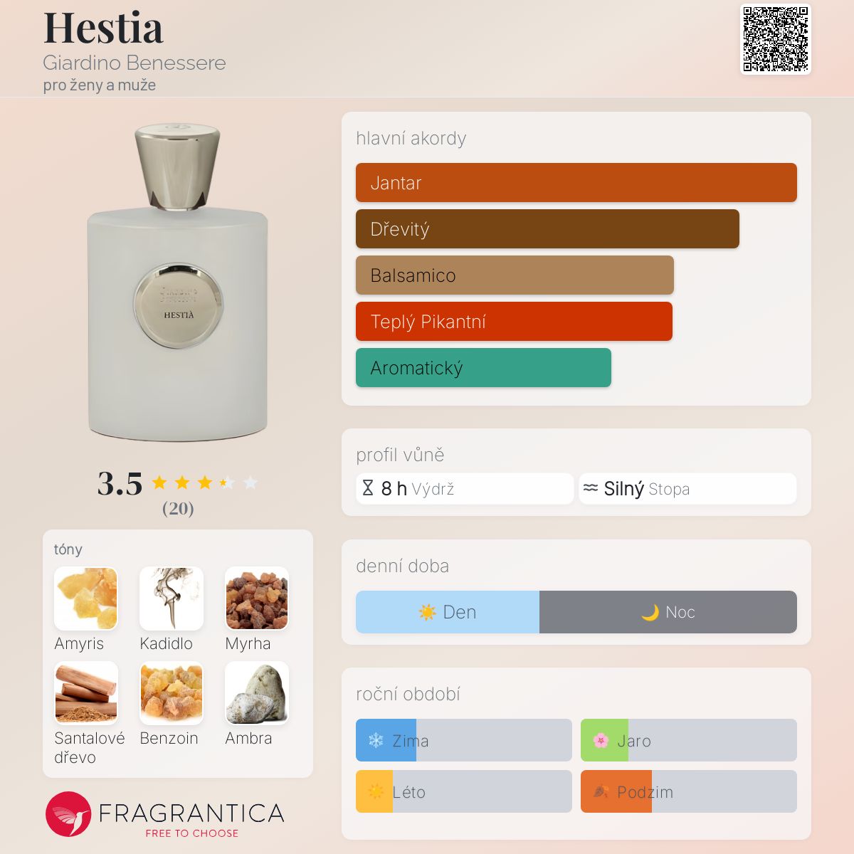 Hestia podle Giardino Benessere je vůně pro ženy a muže. Toto je nová vůně. Hestia byl/a uveden/a v roce 2024. "Nosem" za touto vůní je Paolo Terenzi. Vrchní tóny jsou Kadidlo, Myrha, Kůže a Kardamom; střední tóny jsouAmyris, Australské santalové dřevo, Černý pepř a Bříza ; základní tóny jsou Benzoin, Ambra, Guajakové dřevo, Bílé pižmo a Mandle.