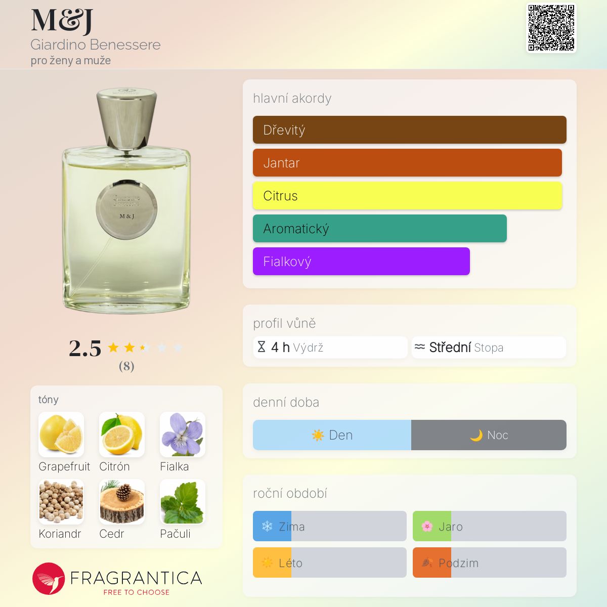 M&J podle Giardino Benessere je Woody Aromatic vůně pro ženy a muže. Toto je nová vůně. M&J byl/a uveden/a v roce 2024. "Nosem" za touto vůní je Paolo Terenzi. Vrchní tóny jsou Grapefruit a Citrón; střední tóny jsouAfrická fialka, Koriandr a Cedr ; základní tóny jsou Singapurské pačuli, Ambra a Labdanum.