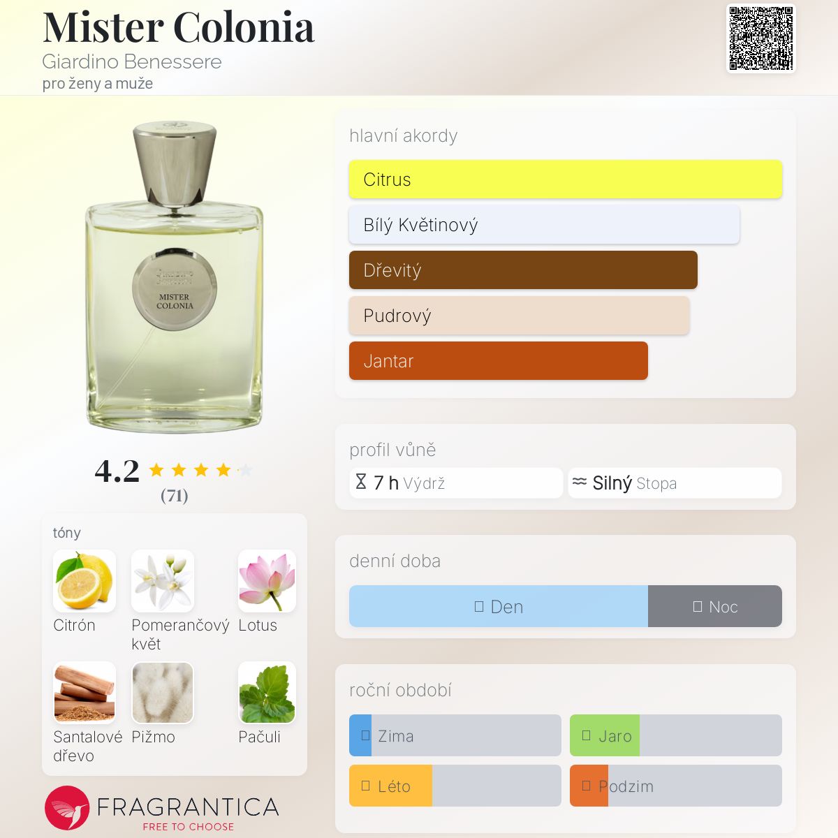 Mister Colonia podle Giardino Benessere je Citrus Aromatic vůně pro ženy a muže. Mister Colonia byl/a uveden/a v roce 2022. "Nosem" za touto vůní je Paolo Terenzi. Vrchní tóny jsou Citrón, Pomerančový květ, Pižmo, Ambra a Myrha; střední tóny jsouLotus, Toskánský kosatec, Ambra, Jasmín Sambac a Tuberóza ; základní tóny jsou Santalové dřevo, Pačuli, Pižmo a Madagaskarská vanilka.
