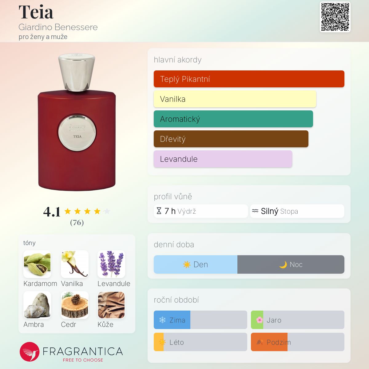 Teia podle Giardino Benessere je vůně pro ženy a muže. Teia byl/a uveden/a v roce 2022. "Nosem" za touto vůní je Paolo Terenzi. Vrchní tóny jsou Guatemalský kardamom, Levandule, Ambra a Haitský vetiver; střední tóny jsouVanilka, Cedr, Kůže, Laoský oud a Kadidlo ; základní tóny jsou Santalové dřevo, Šafrán, Pačuli a Pižmo.