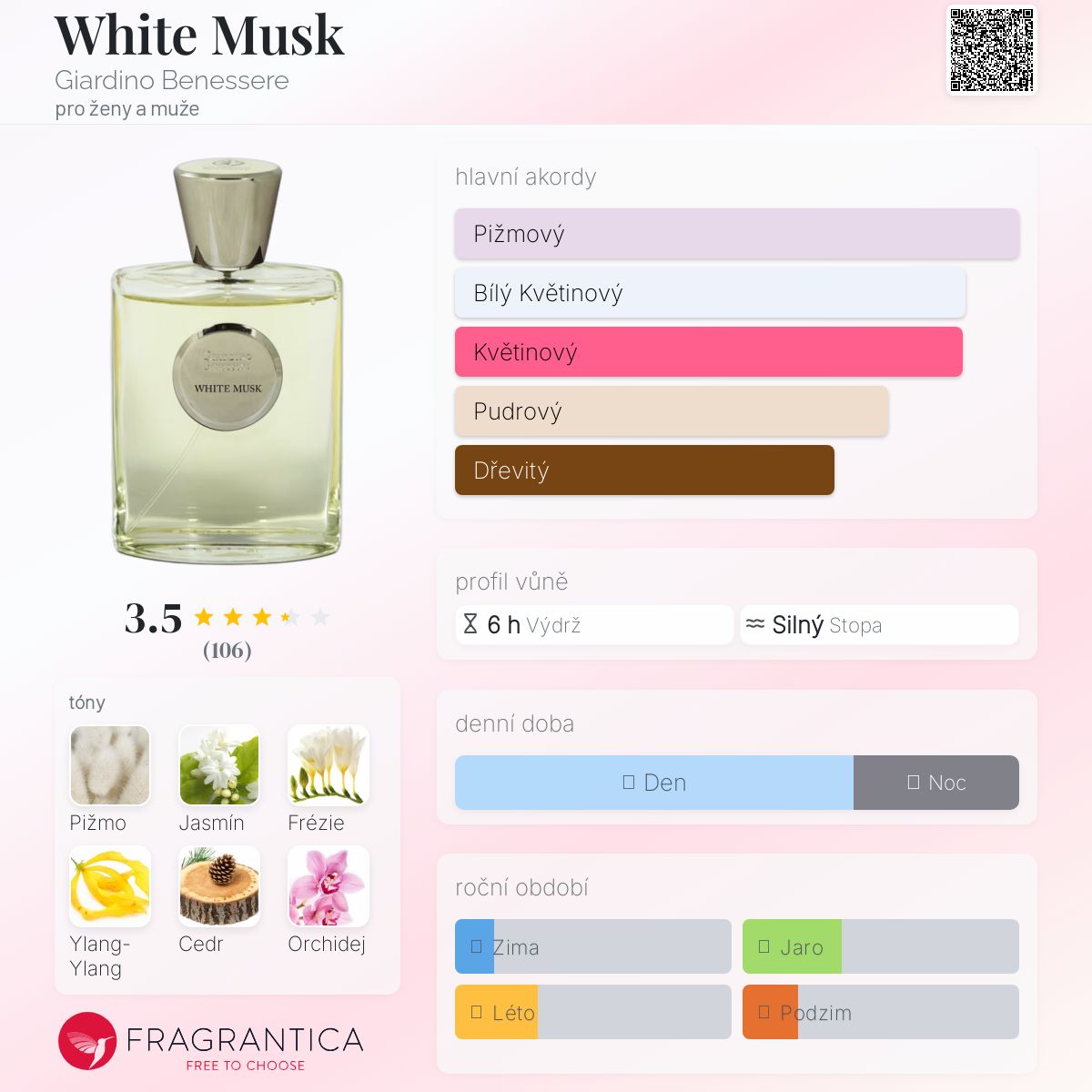 White Musk podle Giardino Benessere je Floral Woody Musk vůně pro ženy a muže. White Musk byl/a uveden/a v roce 2015. "Nosem" za touto vůní je Paolo Terenzi. Vrchní tóny jsou Frézie, Bergamot a Broskev; střední tóny jsouJasmín, Ylang-Ylang a Bílá orchidej ; základní tóny jsou Pižmo, Cedr a Guajakové dřevo.