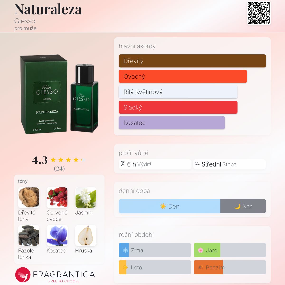 Naturaleza podle Giesso je Floral vůně pro muže. Naturaleza byla spuštěna během 2020. Vrchní tóny jsou Červené ovoce, Hruška a Mandlový krém; střední tóny jsouJasmín, Růžový pepř a Tuberóza ; základní tóny jsou Dřevité tóny, Fazole tonka a Kosatec.