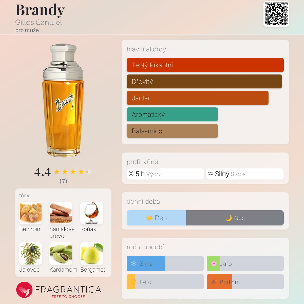 Brandy podle Gilles Cantuel je Orientální Spicy vůně pro muže. Vrchní tóny jsou Jalovec a Bergamot; střední tóny jsouKoňak a Kardamom ; základní tóny jsou Benzoin a Santalové dřevo.