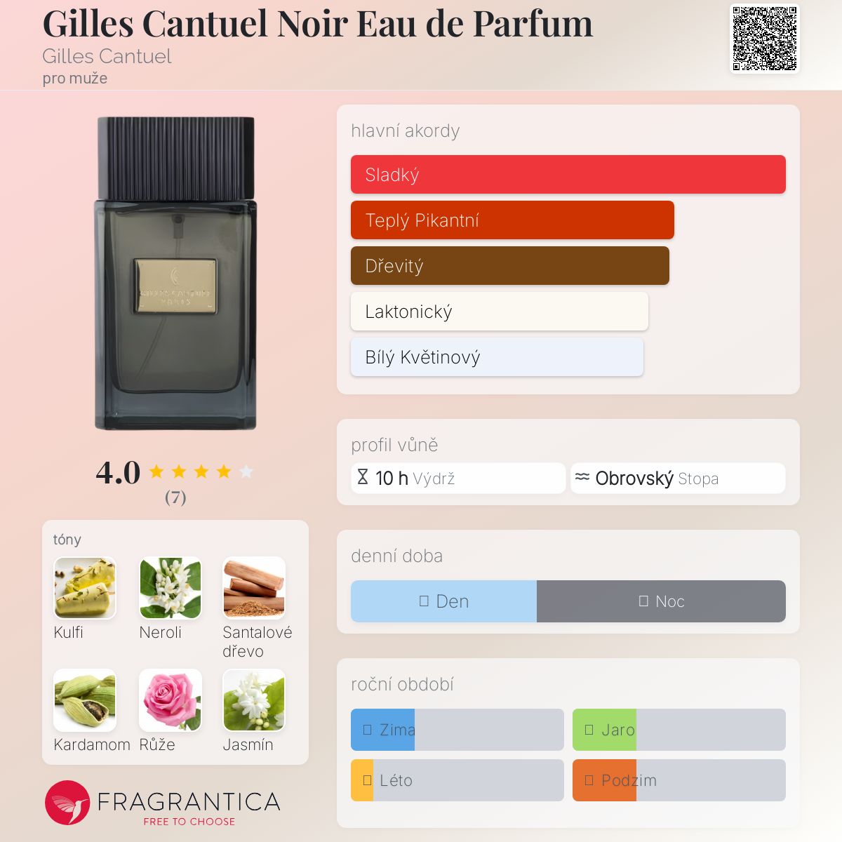 Gilles Cantuel Noir Eau de Parfum podle Gilles Cantuel je Orientální Spicy vůně pro muže. Gilles Cantuel Noir Eau de Parfum byl/a uveden/a v roce 2019. Vrchní tóny jsou Kardamom, Muškátový oříšek, Šafrán a Mandarinka; střední tóny jsouKulfi, Neroli, Růže, Jasmín a Masticha ; základní tóny jsou Santalové dřevo, Vanilka, Jantar (ambra) a Dřevité tóny.