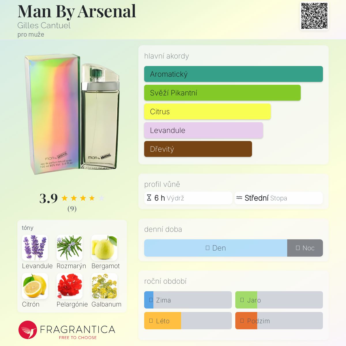 Man By Arsenal podle Gilles Cantuel je Woody Aromatic vůně pro muže. Man By Arsenal byl/a uveden/a v roce 1998. Vrchní tóny jsou Levandule, Rozmarýn, Bergamot, Citrón a Galbanum; střední tóny jsouPelargónie a Kořen orris ; základní tóny jsou Vetiver, Pačuli a Pižmo.