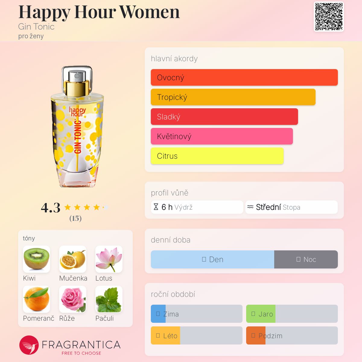 Happy Hour Women podle Gin Tonic je Floral Fruity vůně pro ženy. Happy Hour Women byl/a uveden/a v roce 2009. Vrchní tóny jsou Kiwi, Mučenka a Pomeranč; střední tóny jsouLotus, Růže a Jasmín ; základní tóny jsou Pačuli, Pižmo a Santalové dřevo.