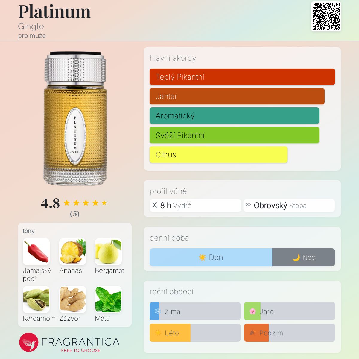 Platinum podle Gingle je Aromatic Spicy vůně pro muže. Platinum byl/a uveden/a v roce 2018. Vrchní tóny jsou Červená paprička, Ananas a Bergamot; střední tóny jsouKardamom, Zázvor a Máta ; základní tóny jsou Fazole tonka, Jantar (ambra) a Kašmírové dřevo.