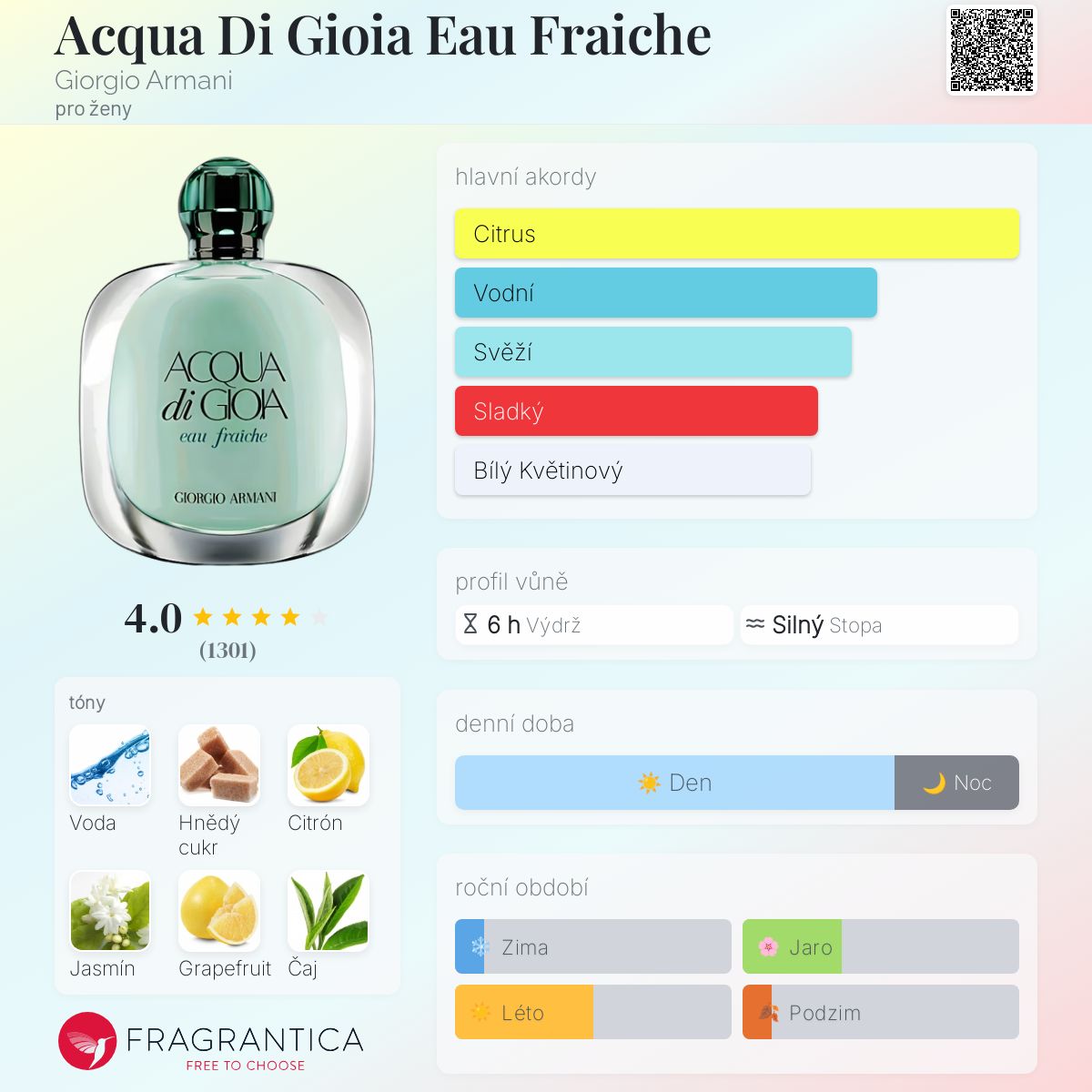 Acqua Di Gioia Eau Fraiche podle Giorgio Armani je Floral Aquatic vůně pro ženy. Acqua Di Gioia Eau Fraiche byl/a uveden/a v roce 2013. Vrchní tóny jsou Citrón, Grapefruit a Mandarinka; střední tóny jsouVodnaté tóny, Vodní jasmín, Čaj a Ylang-Ylang ; základní tóny jsou Hnědý cukr, Pižmo a Cedr.