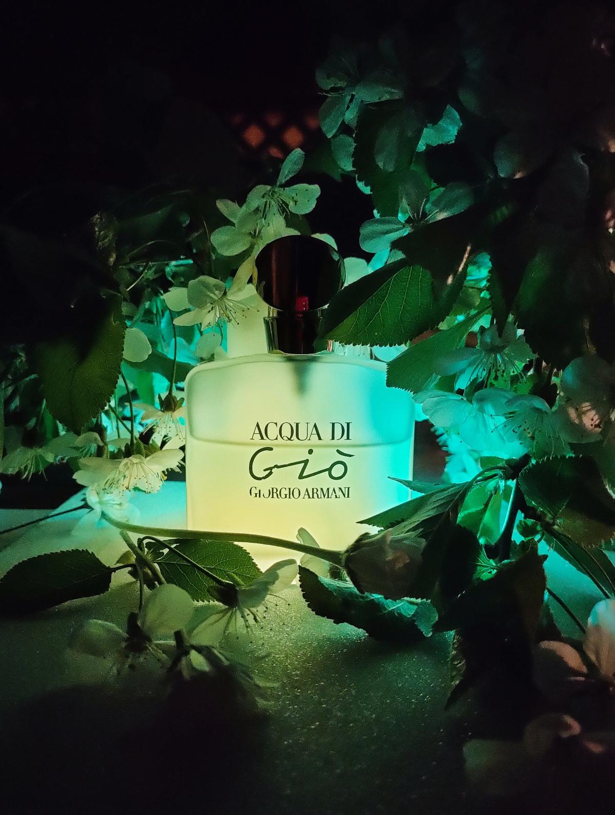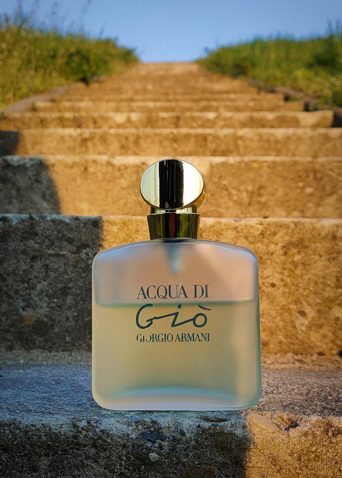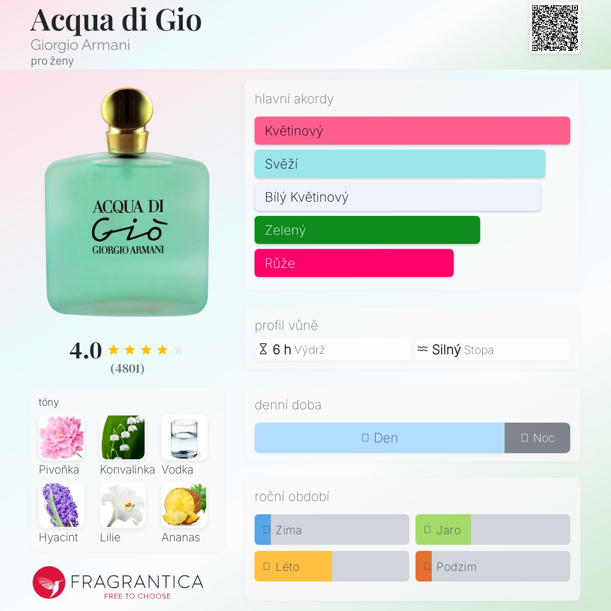 Acqua di Gio podle Giorgio Armani je Floral Fruity vůně pro ženy. Acqua di Gio byl/a uveden/a v roce 1995. "Nosem" za touto vůní je Edouard Fléchier. Vrchní tóny jsou Pivoňka, Pižmová vodka, Ananas, Citrón, Broskev, Banánový list a Fialka; střední tóny jsouKonvalinka, Hyacint, Lilie, Jasmín, Frézie, Calone, Ylang-Ylang a Růže ; základní tóny jsou Pižmo, Cedr, Santalové dřevo, Jantar (ambra) a Styrax.