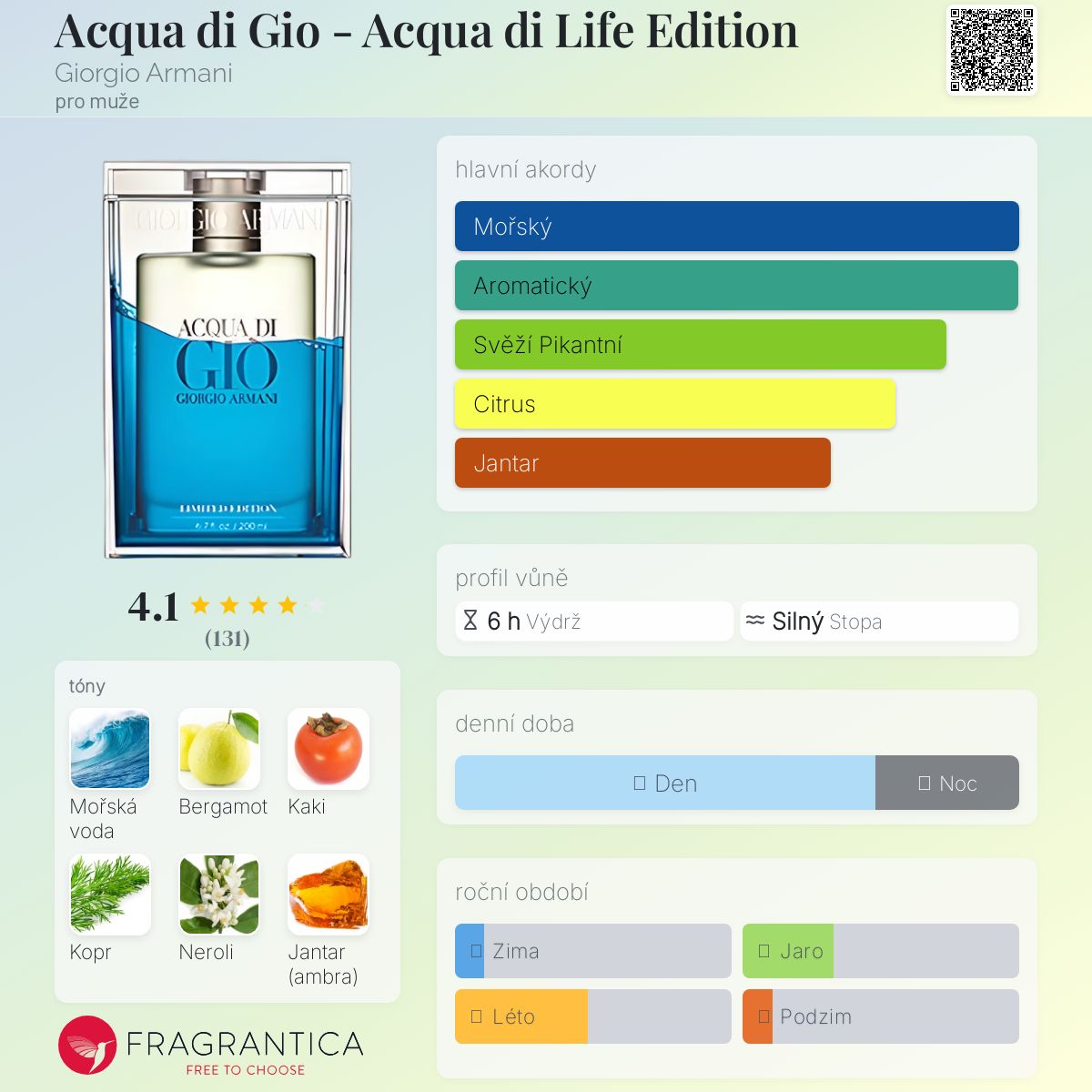 Acqua di Gio - Acqua di Life Edition podle Giorgio Armani je Aromatic Aquatic vůně pro muže. Acqua di Gio - Acqua di Life Edition byl/a uveden/a v roce 2011. Vrchní tóny jsou Mořská voda, Bergamot a Neroli; střední tóny jsouKaki, Řeřicha a Rozmarýn ; základní tóny jsou Jantar (ambra), Francouzské labdanum a Pačuli.