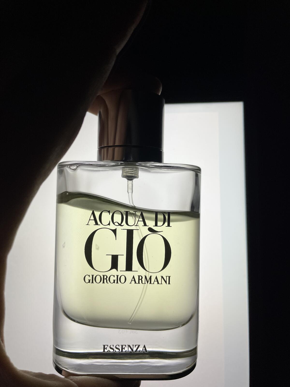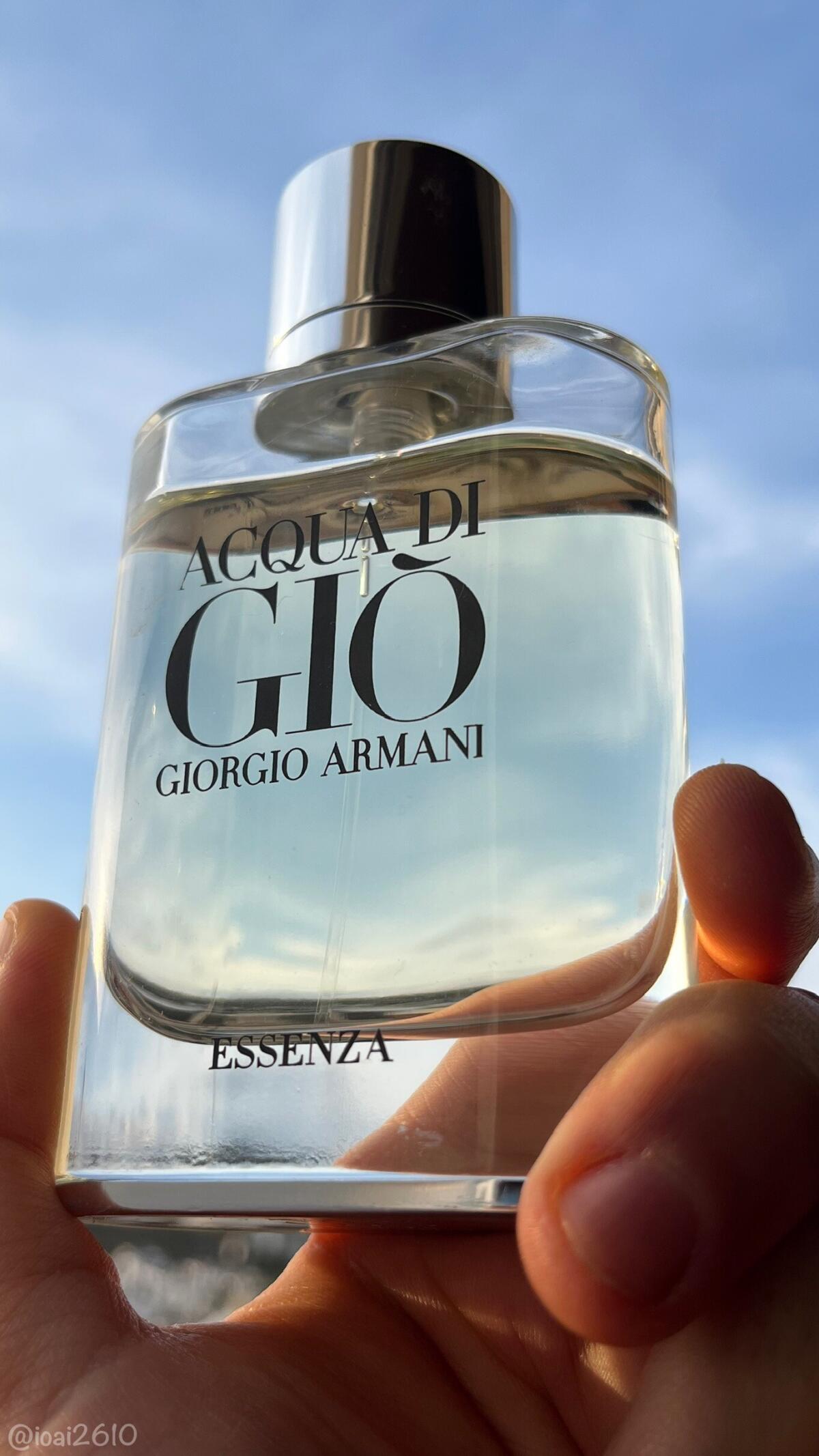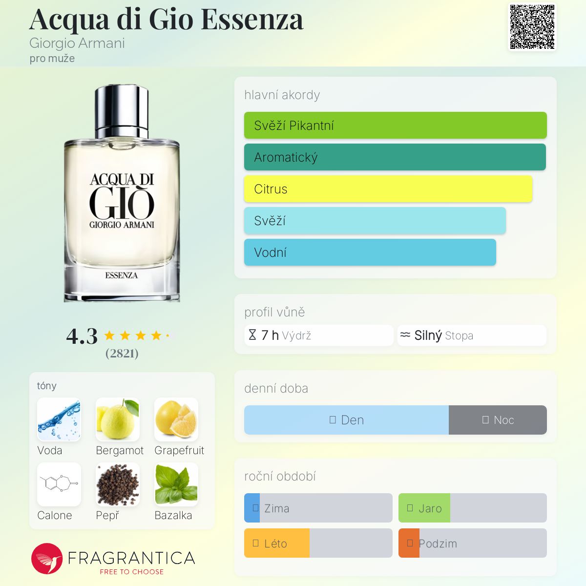 Acqua di Gio Essenza podle Giorgio Armani je Woody Aquatic vůně pro muže. Acqua di Gio Essenza byl/a uveden/a v roce 2012. "Nosem" za touto vůní je Alberto Morillas. Vrchní tóny jsou Vodní tóny, Bergamot, Grapefruit a Calone; střední tóny jsouBazalka, Květinové tóny, Jasmín a Šalvěj ; základní tóny jsou Pepř, Cedr, Pižmo, Vetiver, Ambra, Šalvěj muškátová, Jantar (ambra) a Pačuli.