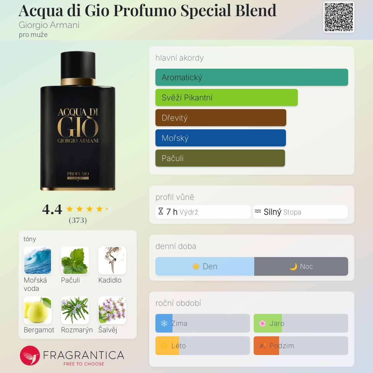 Acqua di Gio Profumo Special Blend podle Giorgio Armani je Aromatic Aquatic vůně pro muže. Acqua di Gio Profumo Special Blend byl/a uveden/a v roce 2017. Vrchní tóny jsou Mořské tóny a Bergamot; střední tóny jsouRozmarýn, Šalvěj a Pelargónie ; základní tóny jsou Pačuli a Kadidlo.
