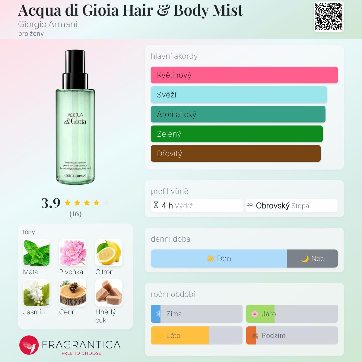 Acqua di Gioia Hair & Body Mist podle Giorgio Armani je Floral Aquatic vůně pro ženy. Acqua di Gioia Hair & Body Mist byl/a uveden/a v roce 2018. Acqua di Gioia Hair & Body Mist byl/a vytvořen/a Loc Dong, Anne Flipo a Dominique Ropion. Vrchní tóny jsou Máta a Citrón; střední tóny jsouPivoňka, Jasmín Sambac a Růžový pepř ; základní tóny jsou Cedr, Hnědý cukr a Labdanum.