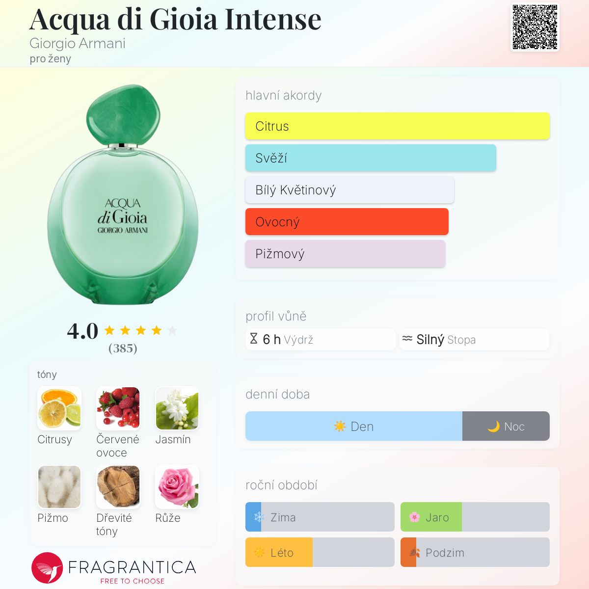 Acqua di Gioia Intense podle Giorgio Armani je Floral Fruity vůně pro ženy. Toto je nová vůně. Acqua di Gioia Intense byl/a uveden/a v roce 2024. Vrchní tóny jsou Citrusy a Červené ovoce; střední tóny jsouJasmín a Damašská růže ; základní tóny jsou Pižmo a Dřevité tóny.
