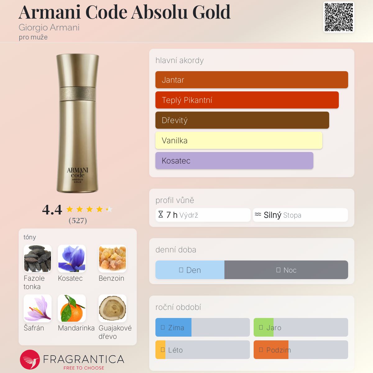 Armani Code Absolu Gold podle Giorgio Armani je Orientální Spicy vůně pro muže. Armani Code Absolu Gold byl/a uveden/a v roce 2020. "Nosem" za touto vůní je Antoine Maisondieu. Vrchní tóny jsou Mandarinka a Zelené jablko; střední tóny jsouKosatec a Šafrán ; základní tóny jsou Fazole tonka, Benzoin, Guajakové dřevo a Cedr.