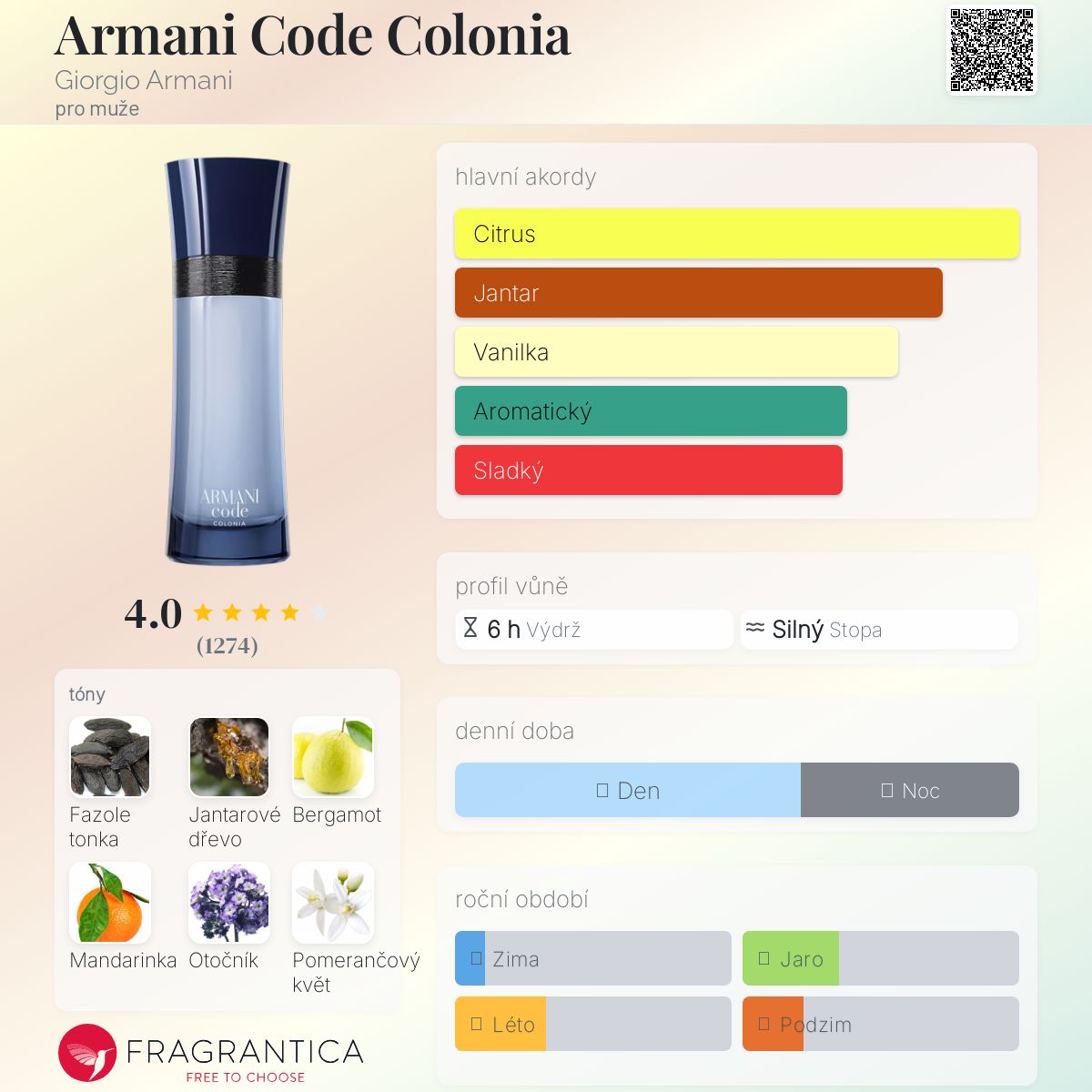 Armani Code Colonia podle Giorgio Armani je Aromatic Fougere vůně pro muže. Armani Code Colonia byl/a uveden/a v roce 2017. "Nosem" za touto vůní je Antoine Maisondieu. Vrchní tóny jsou Bergamot, Mandarinka a Růžový pepř; střední tóny jsouPomerančový květ, Šalvěj muškátová a Amyl Salicylate ; základní tóny jsou Fazole tonka, Jantarové dřevo a Otočník.