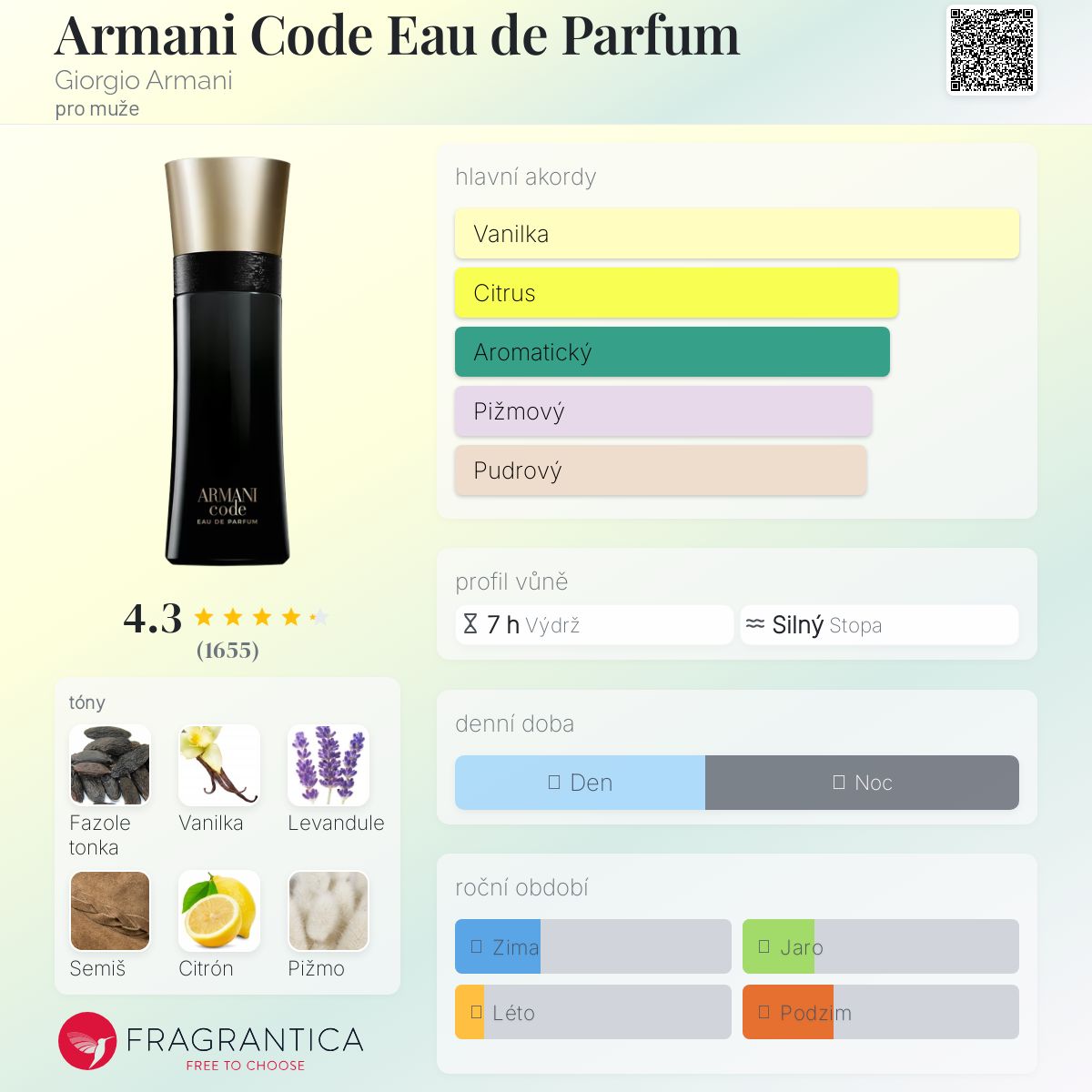 Armani Code Eau de Parfum podle Giorgio Armani je Orientální Fougere vůně pro muže. Armani Code Eau de Parfum byl/a uveden/a v roce 2021. "Nosem" za touto vůní je Antoine Maisondieu. Vrchní tóny jsou Levandule, Citrón a Bergamot; střední tón jeFazole tonka ; základní tóny jsou Vanilka, Semiš, Pižmo a Cedr.