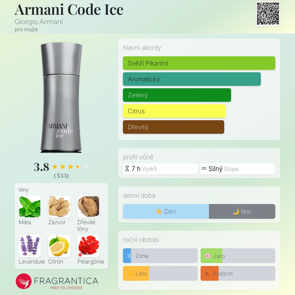 Armani Code Ice podle Giorgio Armani je Aromatic vůně pro muže. Armani Code Ice byl/a uveden/a v roce 2014. Armani Code Ice byl/a vytvořen/a Alberto Morillas a Firmenich. Vrchní tóny jsou Máta, Zázvor a Citrón; střední tóny jsouLevandule, Pelargónie a Šalvěj ; základní tóny jsou Dřevité tóny, Guajakové dřevo a Fazole tonka.
