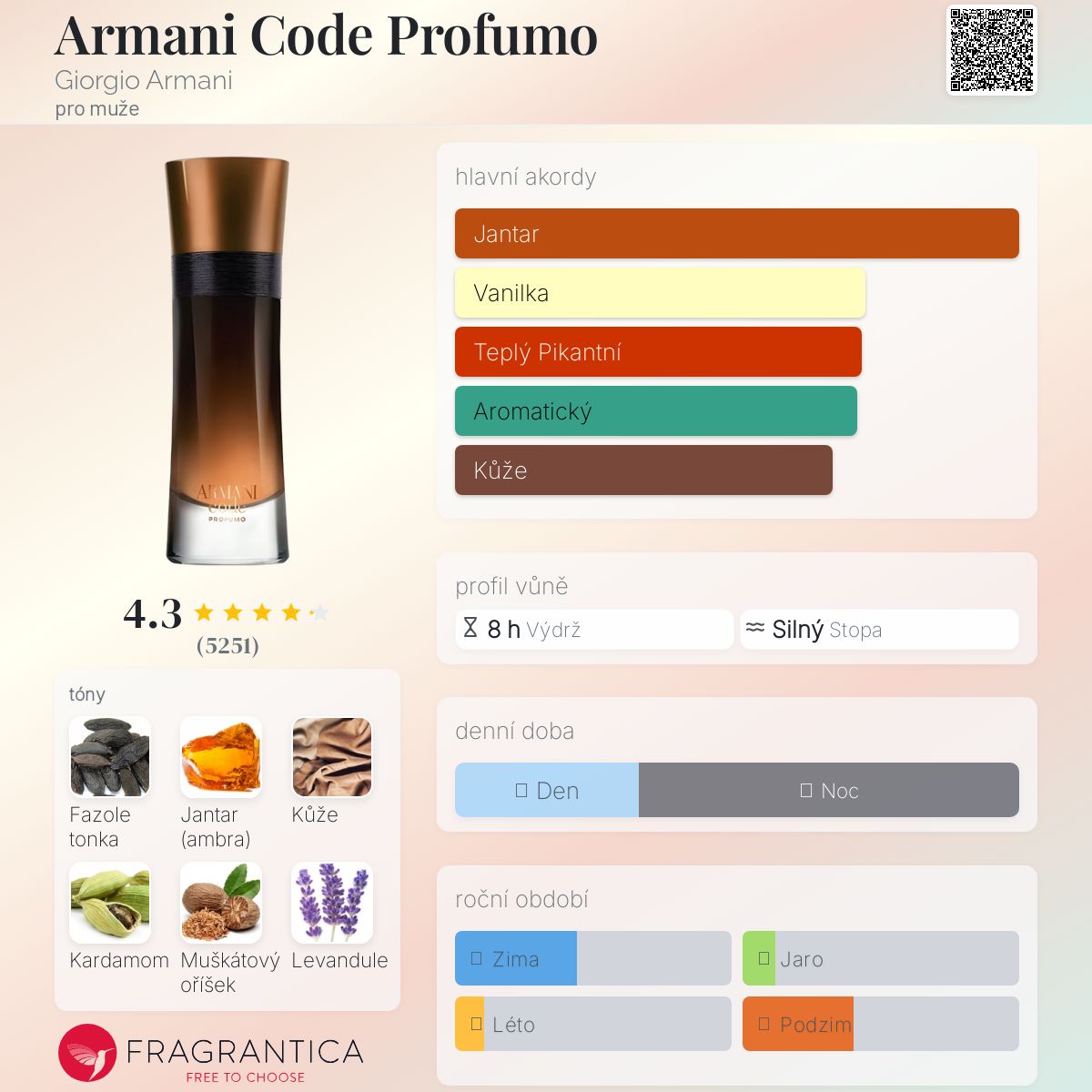 Armani Code Profumo podle Giorgio Armani je Orientální Spicy vůně pro muže. Armani Code Profumo byl/a uveden/a v roce 2016. "Nosem" za touto vůní je Antoine Maisondieu. Vrchní tóny jsou Kardamom, Zelené jablko a Zelená mandarinka; střední tóny jsouMuškátový oříšek, Levandule a Pomerančový květ ; základní tóny jsou Fazole tonka, Jantar (ambra) a Kůže.
